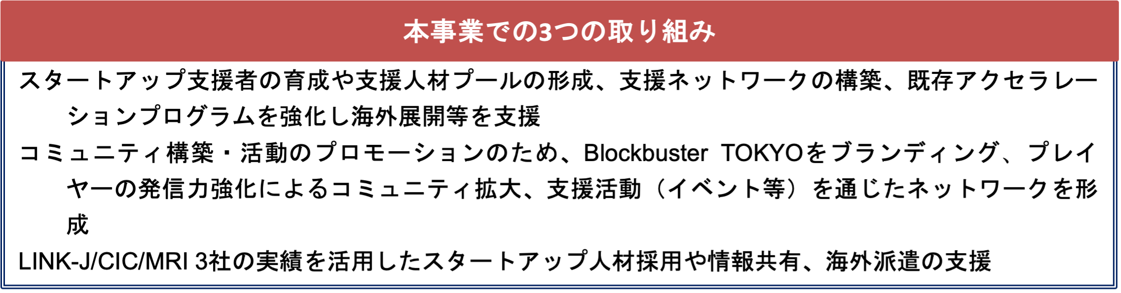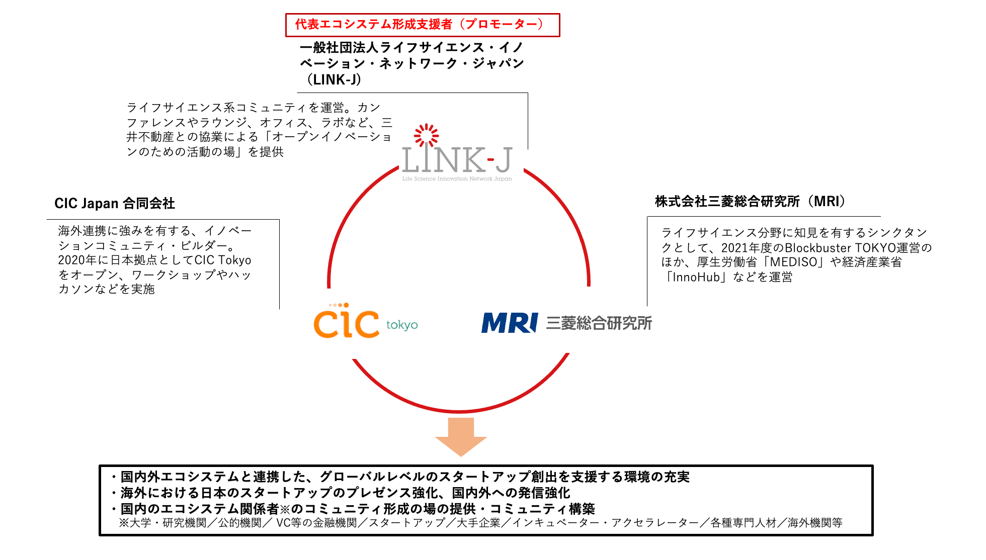 一般社団法人ライフサイエンス・イノベーション・ネットワーク・ジャパン(本社:東京都中央区日本橋室町、理事長:岡野栄之、以下「LINK-J」)、CIC Japan合同会社(本社:東京都港区虎ノ門、職務執行者: Timothy Rowe、以下「CIC Tokyo」)、株式会社三菱総合研究所(本社:東京都千代田区、代表取締役社長:籔田健二、以下「MRI」)の3社はこの度、東京都が実施する創薬・医療系スタートアップ育成支援事業「Blockbuster TOKYO」のエコシステム形成支援者(プロモーター)に採択されました。
