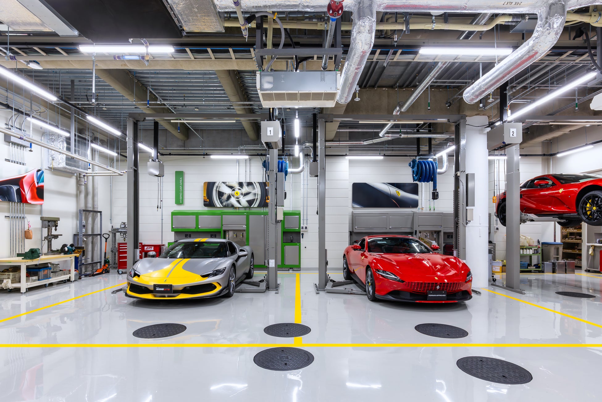 芝と東雲の両サービスセンターは、いずれも「フェラーリ」の最新CIを採用し、レセプションエリアやラウンジスペースなど洗練されたイタリアンデザインとともにサロンのような居心地の良さを感じていただけます。設備は、最新モデルから各年代のモデルに対応可能な治具まで豊富な装備を備え、スタッフは世界のフェラーリ・メカニックの頂点を決めるコンテストで№1に輝いたマスターテクニシャンをはじめ、長年技術を蓄積したベテランスペシャリストを多数配置しています。