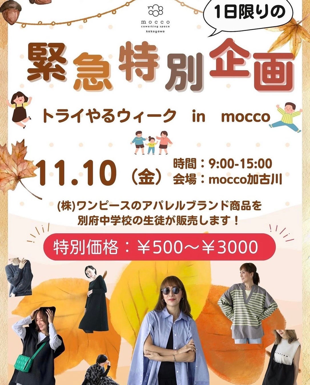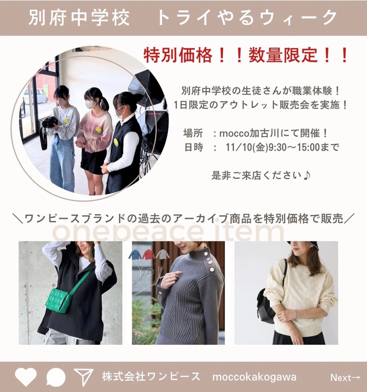 株式会社ワンピースでは同年11月6日(月)~10日(金)の5日間、トライやるウィークとして加古川市立別府中学校の学生3名が職業体験中です。トライやるウィークの集大成として、最終日には中学生による1日限定のアパレルショップが開店します!
