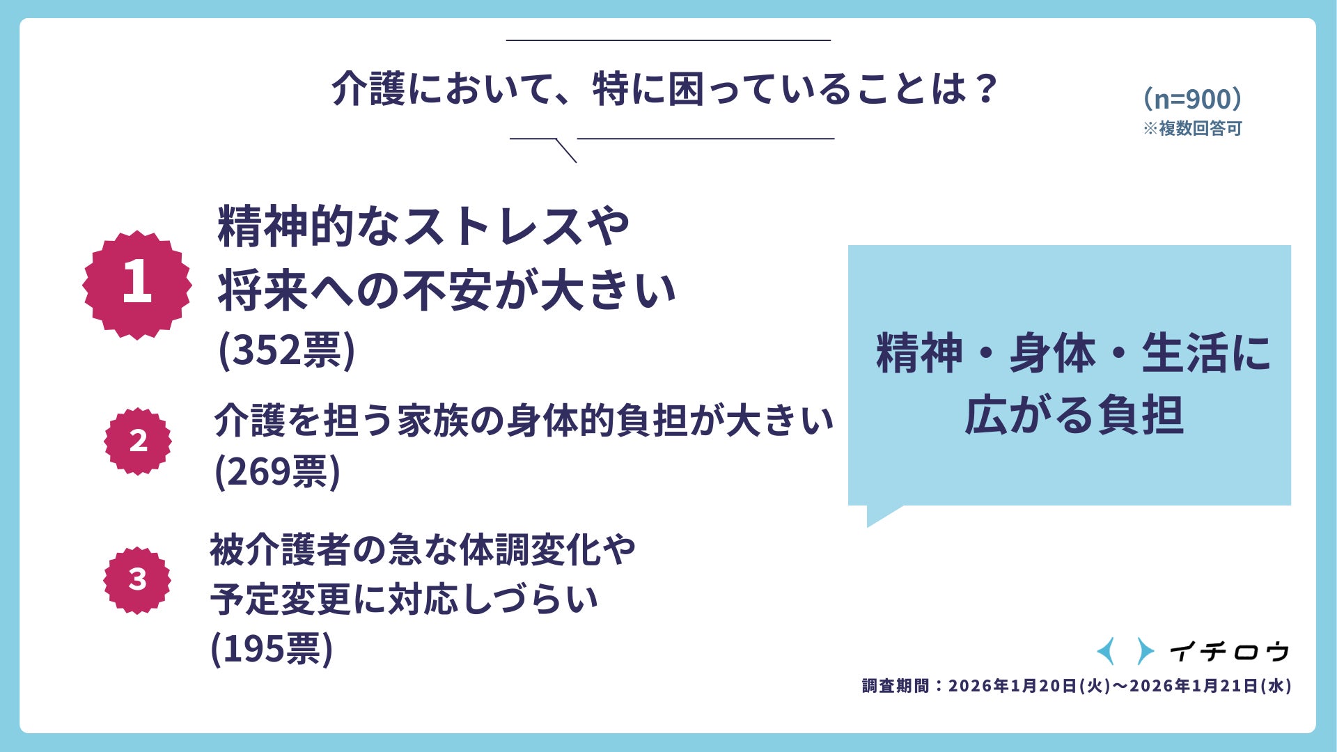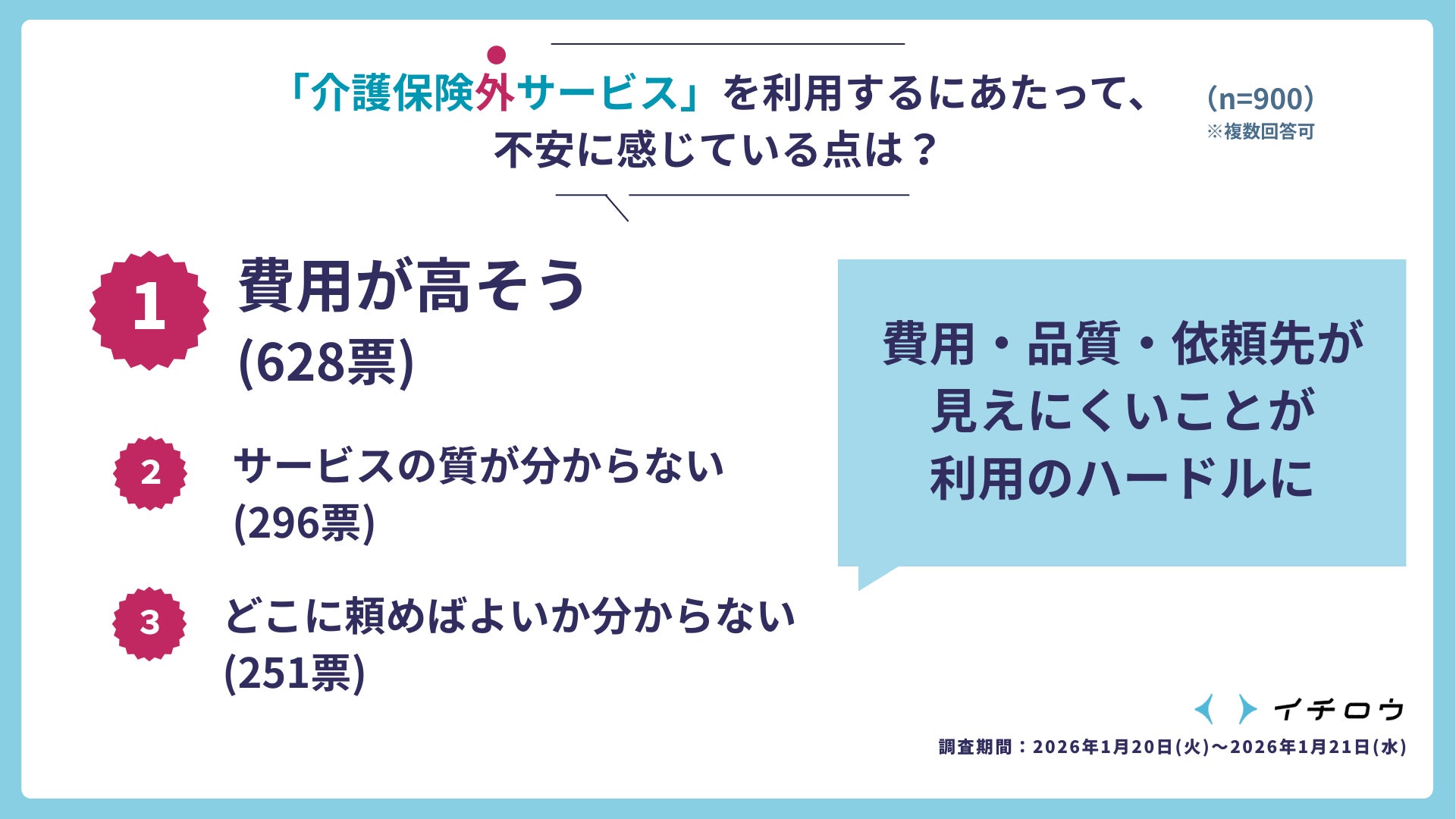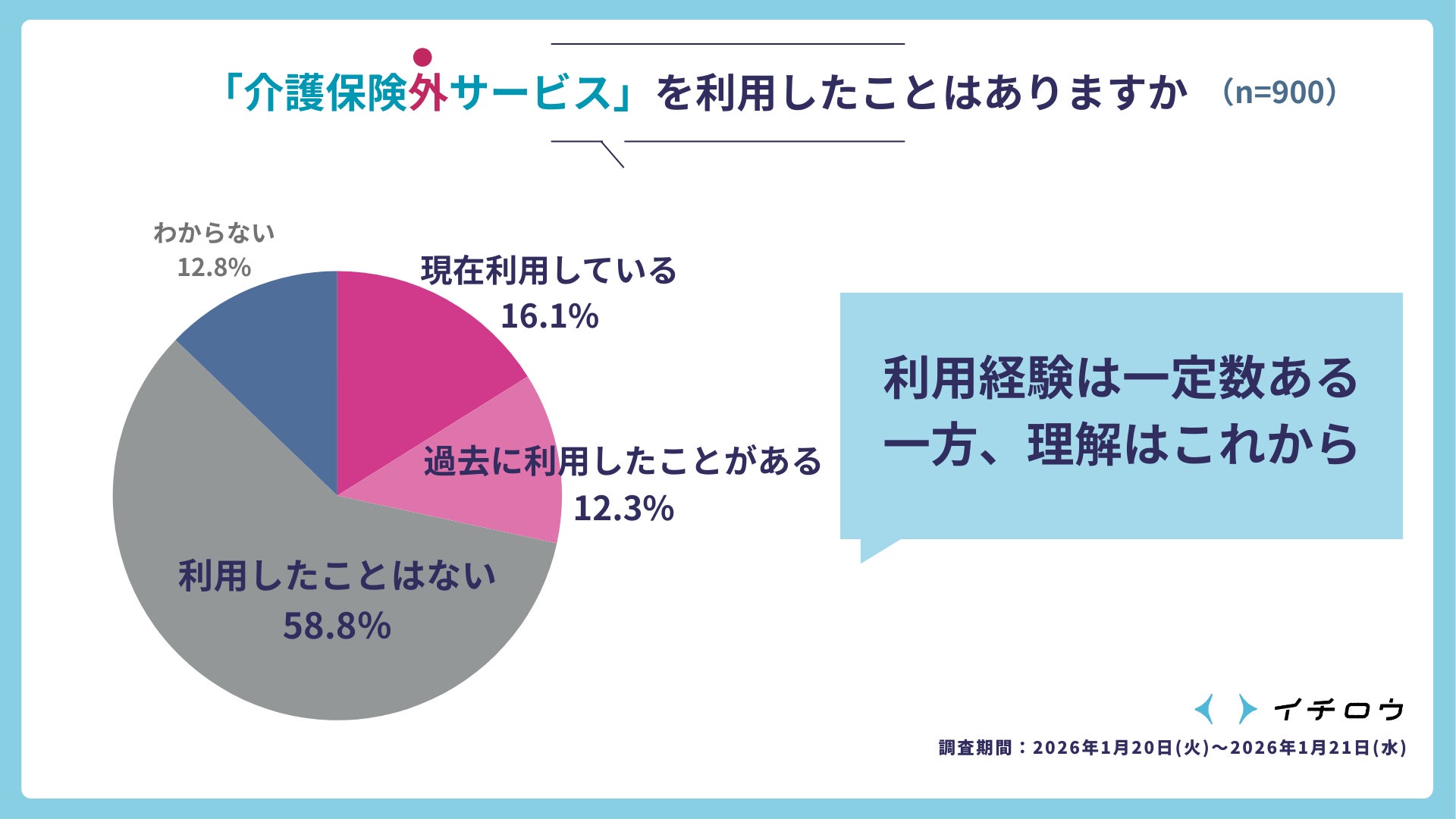 今回の調査結果を見て強く感じたのは、介護保険制度だけでは支えきれない生活の現実が確実に存在しているということです。介護は、予定通りに進むものではありません。急な体調変化や家族の事情、仕事との両立など、現実の生活は常に不確実性の中にあります。その中で、人々は「よく知らないままでも必要だから使う」という選択をしている。これは非常に切実な現実だと思います。イチロウは、制度と制度外の間にあるこのギャップを埋める存在として、「困ったときに、迷わず頼れる選択肢」が社会に当たり前に存在する状態をつくりたいと考えています。介護が「特別な出来事」ではなく、「日常の延長線上の支援」として選択できる社会を目指し、これからもサービスづくりと環境整備に取り組んでまいります。