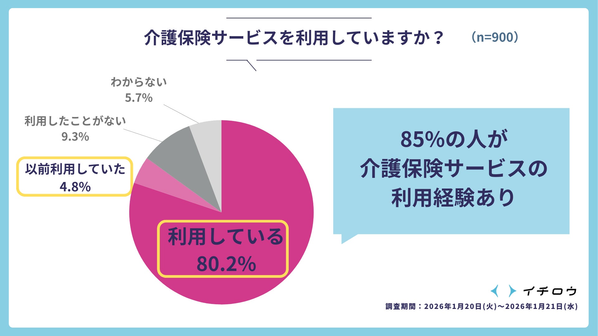 介護保険サービスについては、「現在利用している」(80.2%)、「以前は利用していた」(4.8%)を合わせ、約85%が利用経験ありと、多くの人に浸透していることが分かりました。