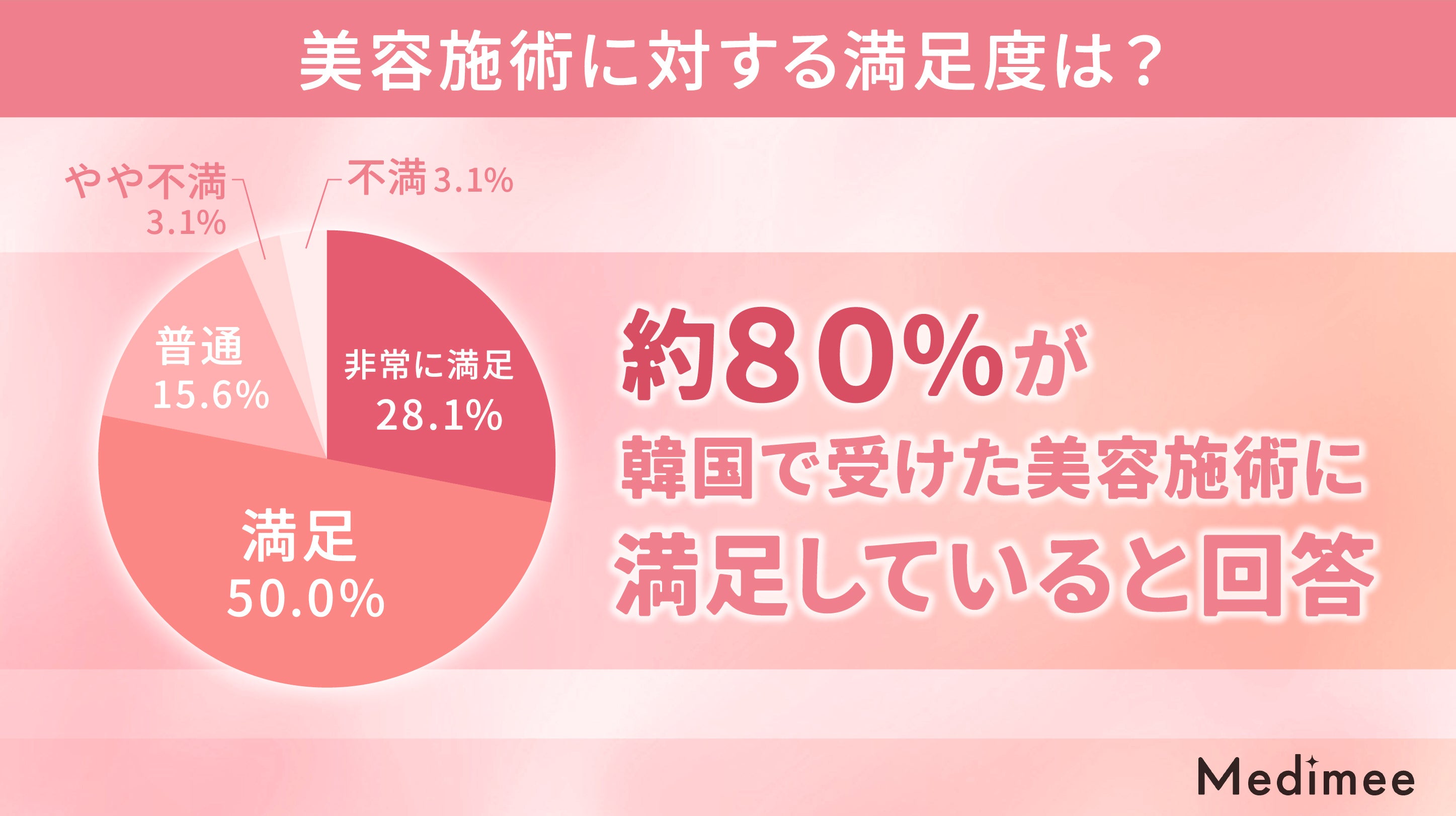 韓国の美容医療経験者にアンケート調査を行ったところ、約8割の人が韓国の美容施術に対して満足しており、ほぼ100%の人がまた韓国で施術を受けたいと回答しました。また、施術の種類やサービスの豊富さ、価格の安さなど、美容医療が発達している韓国ならではの魅力を感じている人が多いことが分かりました。ダウンタイムの間も周りの目を気にすることなく観光を楽しめることも、韓国で施術を受ける理由の一つになっているようです。
