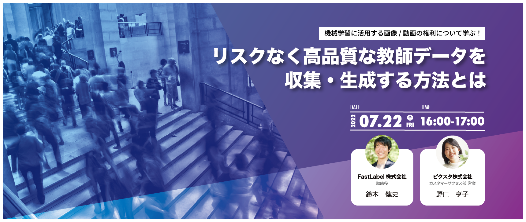 AI革命のインフラを目指すFastLabel株式会社(本社:東京都品川区、代表取締役CEO:上田英介、以下「FastLabel」)は、写真・イラスト・動画・音楽素材のマーケットプレイス「PIXTA」を運営するピクスタ株式会社(本社:東京都渋谷区、代表取締役社長:古俣大介、以下「ピクスタ」)と、共同セミナー「機械学習に活用する画像/動画の権利について学ぶ!リスクなく高品質な教師データを収集、生成する方法とは」を、2022年7月22日(金)16時よりオンラインで開催いたします。