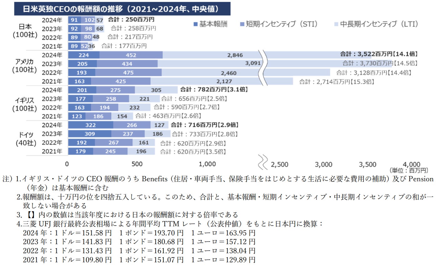 2024 年における CEO の報酬額の中央値は、日本が約 2.5 億円、アメリカが約 35.2 億円、イギ
