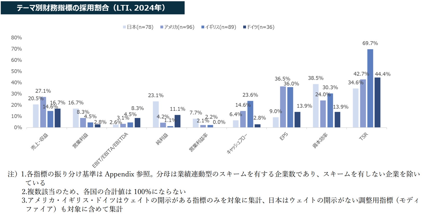 LTIにおいて、日本は資本効率関連の指標の採用割合が最も高くなっています。アメリカ・イギリス・ドイツはTSR(株主総利回り)関連の指標の採用割合が最も高く、日本でもその採用割合は年々増加しています。