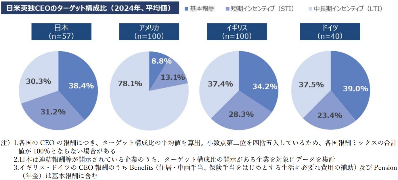 2024年におけるCEOの報酬額(中央値)は、日本が合計2.5億円、アメリカが35.2億円、イギリスが7.8億円、ドイツが7.2億円という結果でした(図表1)。日本のCEOの報酬額は、欧米と比較してかなり低水準となっています。