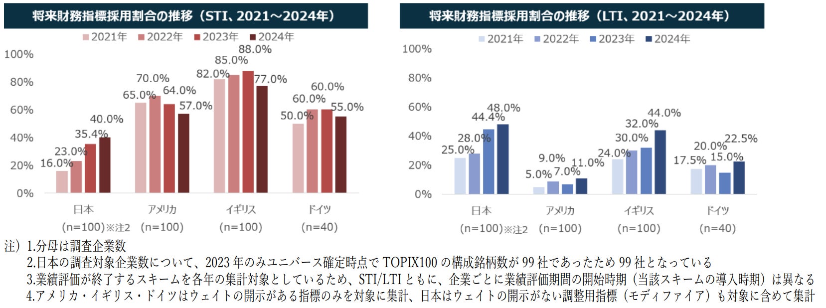 アメリカ・イギリス・ドイツでは、STIで将来財務指標の採用割合がLTIより高いものの減少傾向にあります。また、イギリスはLTIで将来財務指標の採用割合が年々増加しており、アメリカ・ドイツも増加傾向にあります。