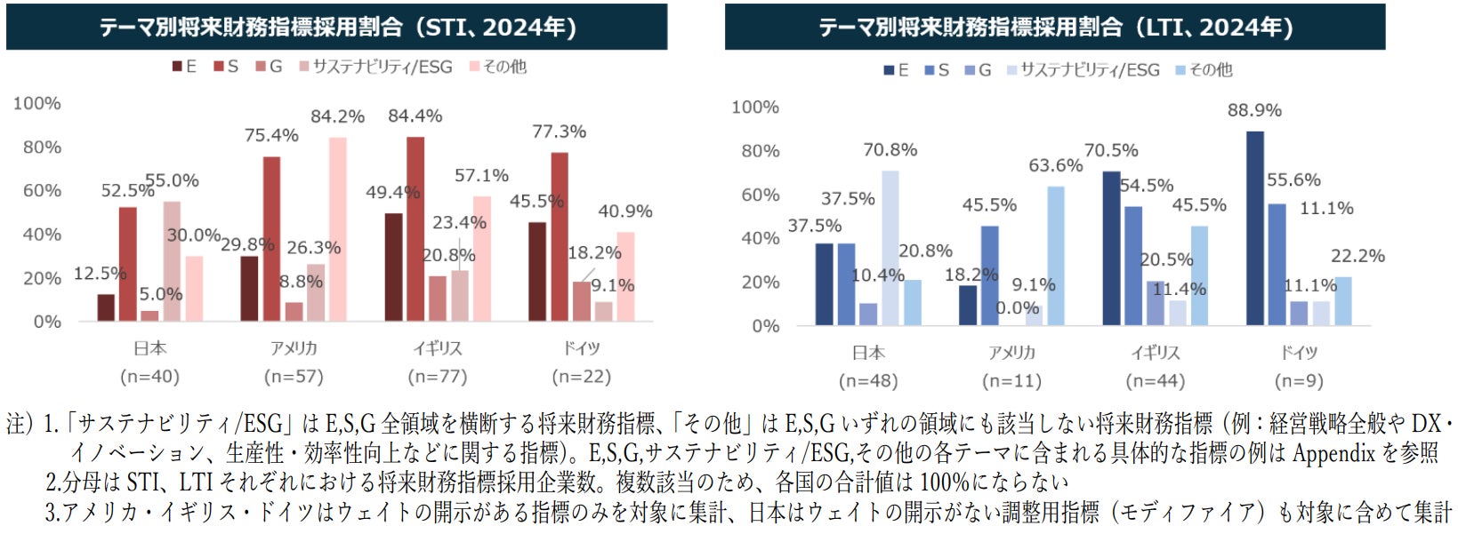 一方、アメリカは、STI及びLTIで「その他」領域の指標の採用割合が最も高く、イギリス・ドイツと比較すると、STI及びLTIで「E」「S」「G」各領域の指標の採用割合が最も低くなっています。また、イギリスはSTI及びLTIで「G」領域の指標の採用割合が最も高く、ドイツはLTIで「E」「S」領域の指標の採用割合が最も高くなっています。