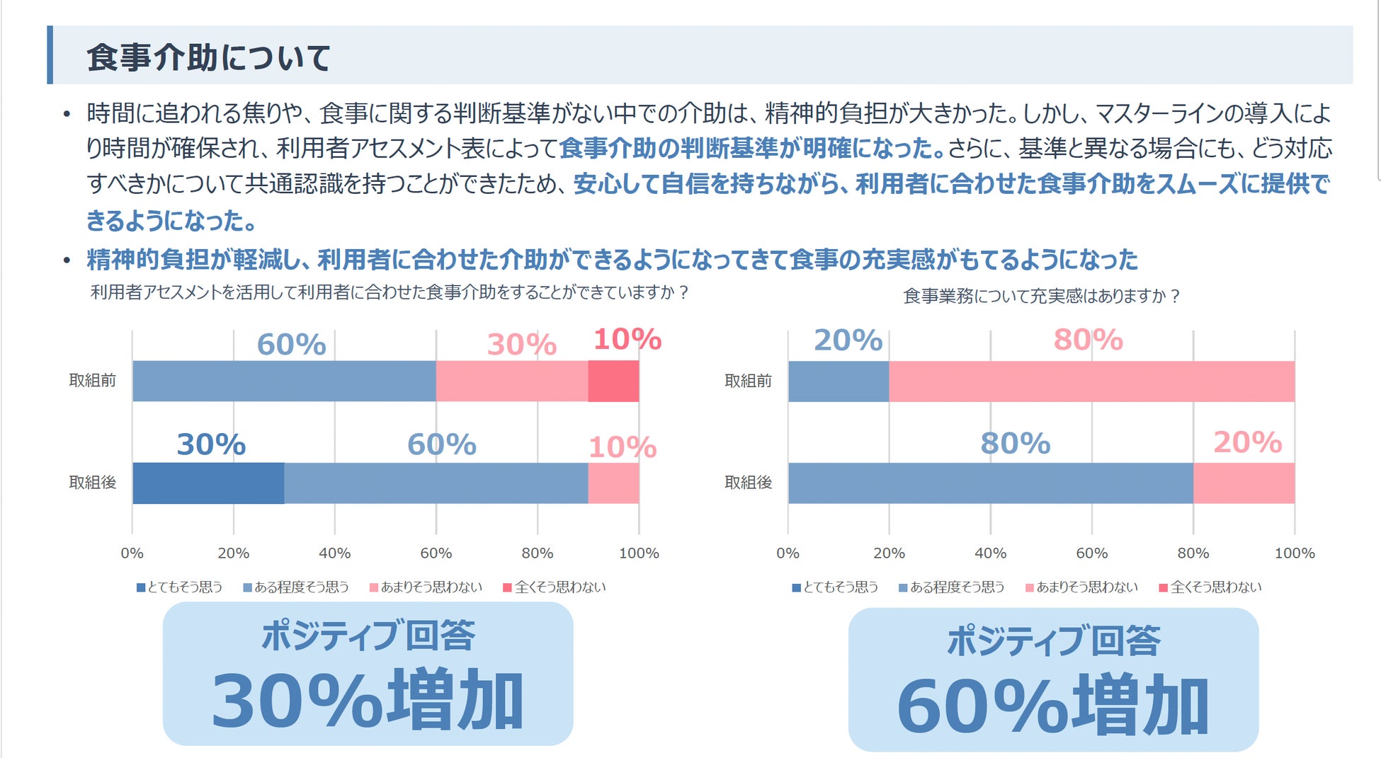 アンケートや対話によって職員が今一番課題に思っている業務が食事業務であり、その中でも覚醒の低い方への朝の食事介助について不安を抱えていたことがわかった。なぜ覚醒が低いのか利用者の生活リズムを確認するため、見守り機器「眠りスキャン」のデーターを活用し、同時に同一期間における食事介助の時間、量、様子などデーターをとった。そうすると覚醒が低いながらも生活リズムはあり、安定している状態ということがわかり、利用者の状況は一定であることが分かった。そこで分かったことは食事介助時間や職員の関わり方にムラがあることが食事介助の大変さを生み出している要因かもしれないということであった。そこで利用者一人一人の食事に関する平常時の情報(データ)を見える化し、職員の認識を統一し、どのような基準で食事介助をするかについてのルールを作り運用したその結果、利用者に合わせた関わりができるようになり、職員の不安も軽減。職員の食事介助に対する充実感は上がり、職員全員がテクノロジーの活用やデーターを活用したケア実践を実感できた取組みになった