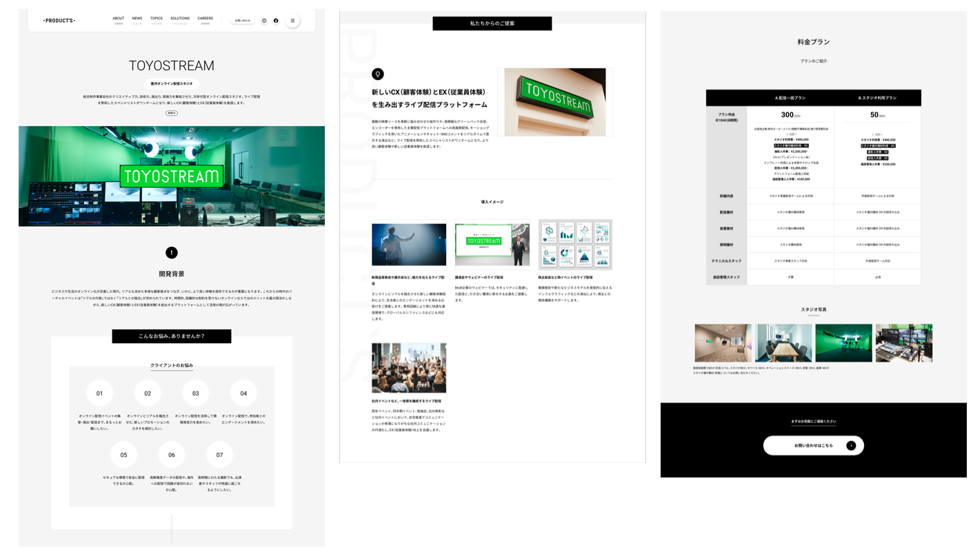 クライアントニーズの高い最新ソリューション情報を、魅力的かつ機能的に伝えるためのサービスページを新設。導入事例やサービスプランのご紹介に加え、資料ダウンロード機能やお問い合わせの追従ボタン設置など、ソリューション導入をイメージしやすく、読み手の目的に合ったアクションを起こしやすい設計としています。
