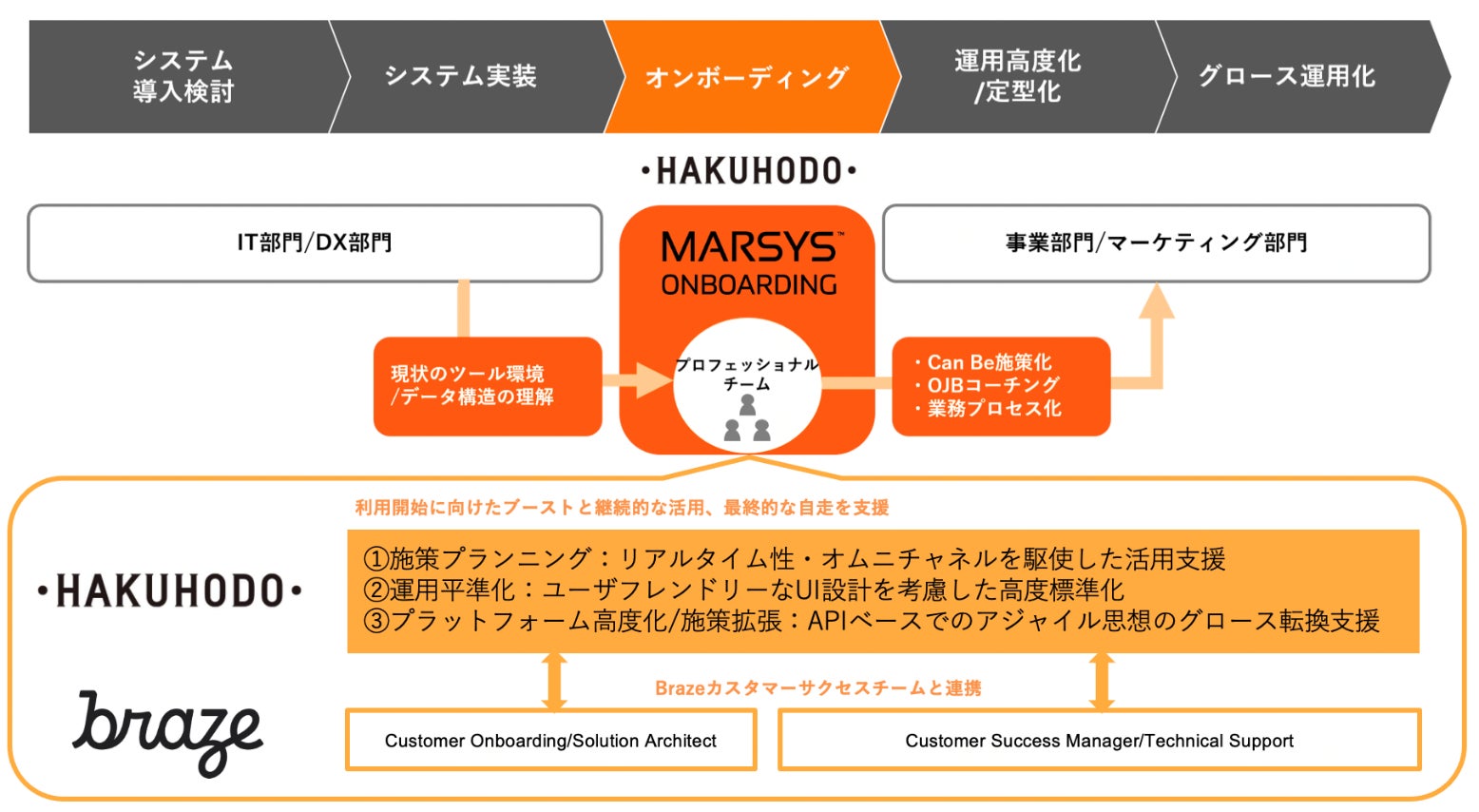 また、Brazeとの共同ソリューションの第一弾として、「HAKUHODO Marsys Onboarding(博報堂マーシス・オンボーディング)」のBraze版を開発し、2023年3月よりサービス提供を開始する予定です。本サービスにより、博報堂のプロフェッショナル人材とBrazeのカスタマーサクセスチームが連携し、組織・ナレッジ等の企業が直面するツール構築から運用における課題解決をすることで、企業のグロースと自走化を支援します。
