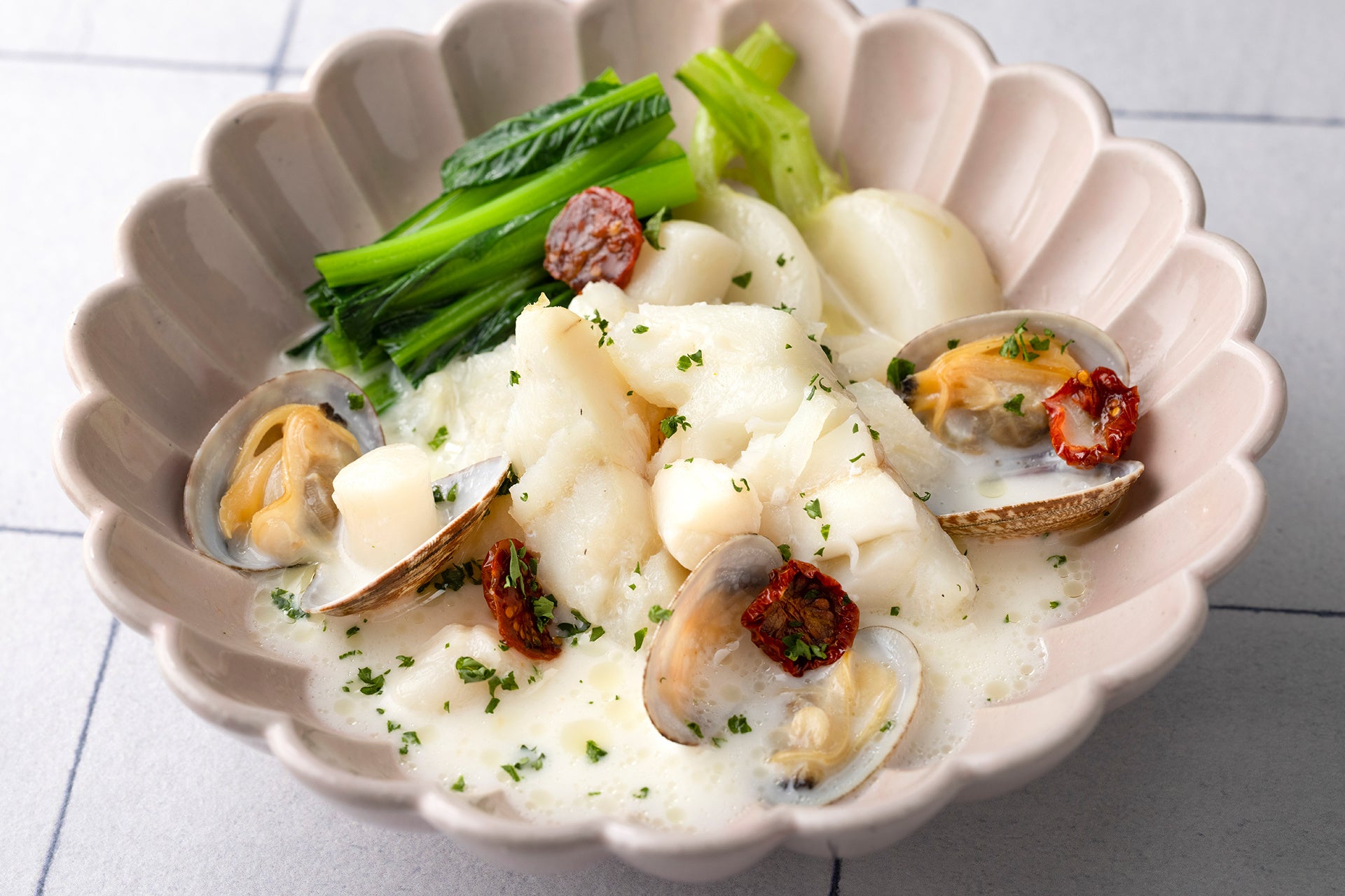 白身魚と魚介のナージュ、豚肩ロースのコンフィ シャリアピンソース、
