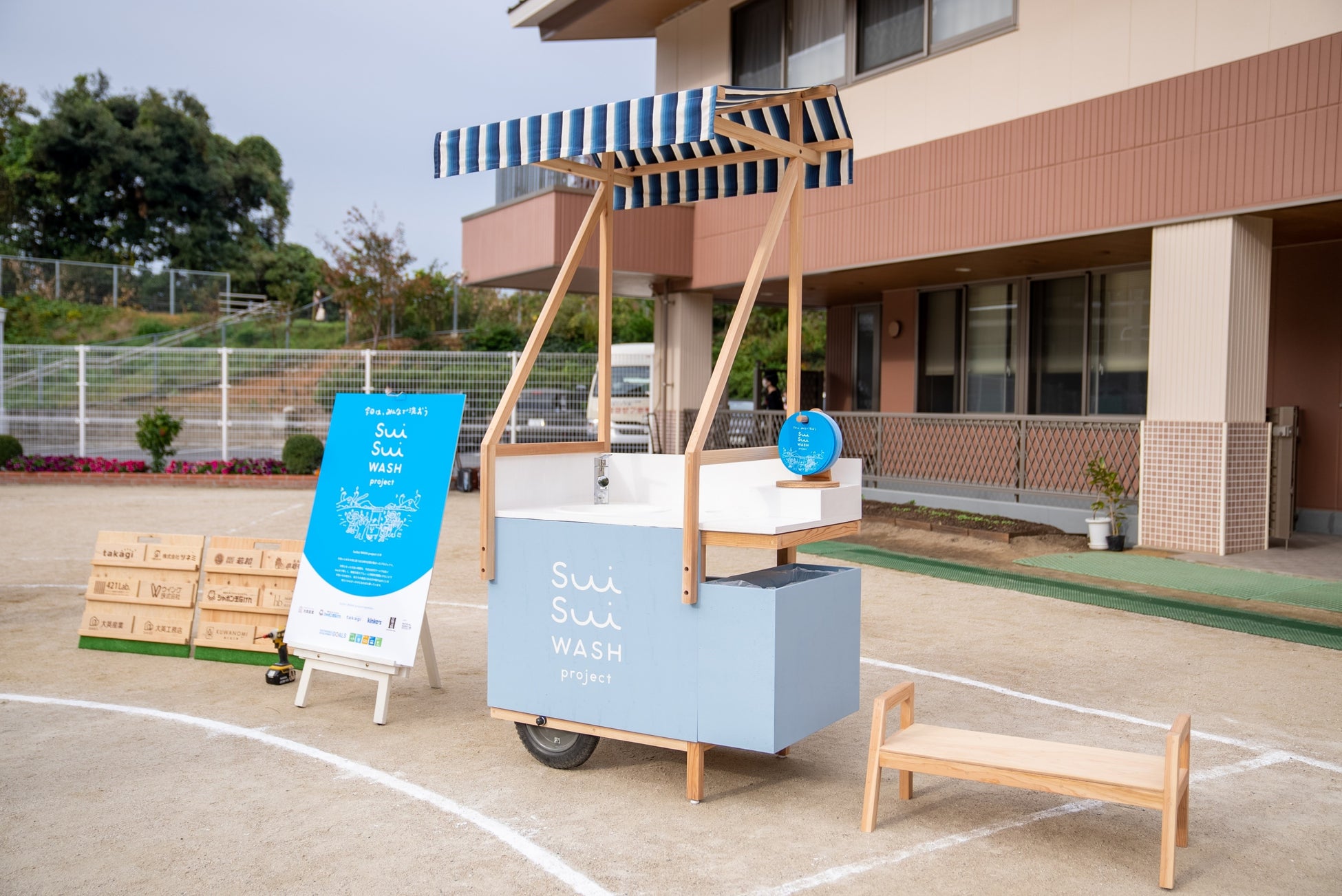 その“リヤタイ”をベースに、株式会社タカギ製の洗面用水栓と株式会社小倉縞縞の小倉織を搭載し、シャボン玉石けん株式会社の手洗い石けんを活用し、手洗い啓発イベントで使用できる「SuiSuiリヤタイ」が完成しました。
