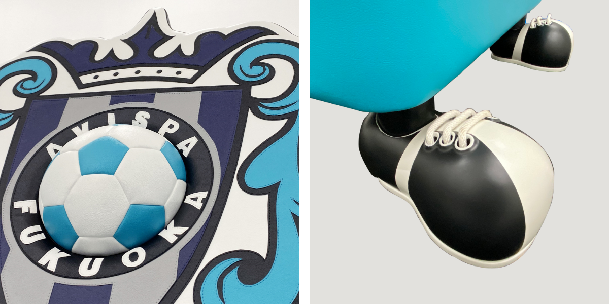ソファの脚部のデザインは、アビスパ福岡公式キャラクターのアビーくんのスパイクデザインを踏襲。多軸加工機器CNCという国内でも希少な機械を活用し、無垢材を削り出し立体的に製作しました。