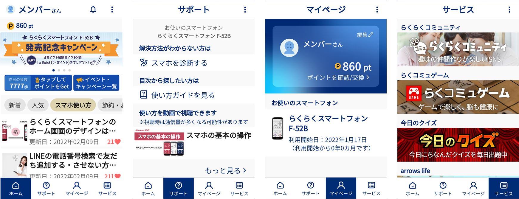 「La Member’s」は、らくらくスマートフォンユーザーだけなく、arrowsユーザーにもご利用いただけます。昨年冬モデルの機種から対応し、今後も順次拡大していきます。サービス開始時の提供内容として、ご利用機種の基本操作をわかりやすく解説した使い方動画やご利用中のスマートフォンの使いこなし向上に役立つ情報記事の提供に加え、毎日の歩数や記事の閲覧などで日々貯めることができるLa Point(ラ・ポイント)(注2)の提供やさまざまなイベントやキャンペーンなど、毎日楽しくお得に新しい体験に出会うことができる会員特典をご用意しています。