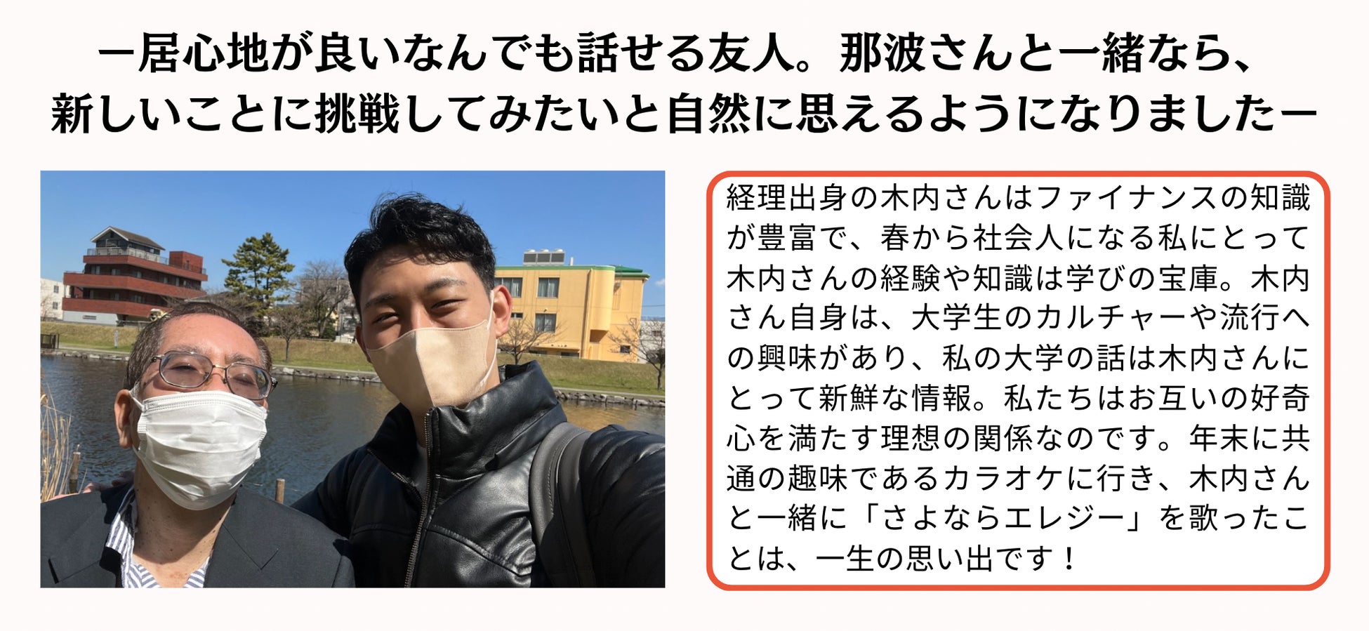 2020年の創業依頼、約1.5万人のシニア世代と対話を重ねてまいりました。その中で、「実はこんなことがしたい」「こんなことに興味がある」という能動的な興味関心がシニアの中に多くあることを知りました。そこで創業初期にサービスを開始したのが、シニアの”もっともっと”を引き出し、実現を後押しする孫世代の相棒サービス「もっとメイト」です。
