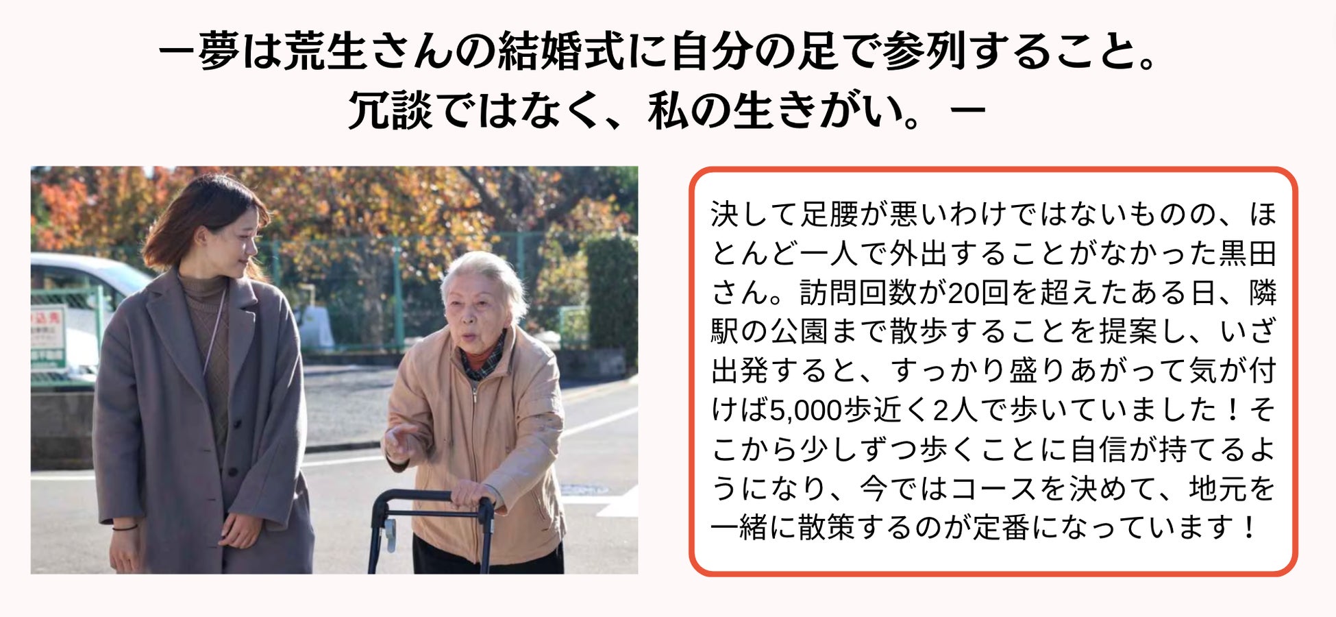 最初は、祖母が明るく前向きにワクワクしながら生きる社会を作りたくて1人で始めた事業が、”Age-Well”を掲げた今では、共感してくれる仲間が集い、多くの企業との共創が生まれ、そして何より、弊社のサービスを必要としてくださるシニアの方が年間1万人を越えるまでになりました。