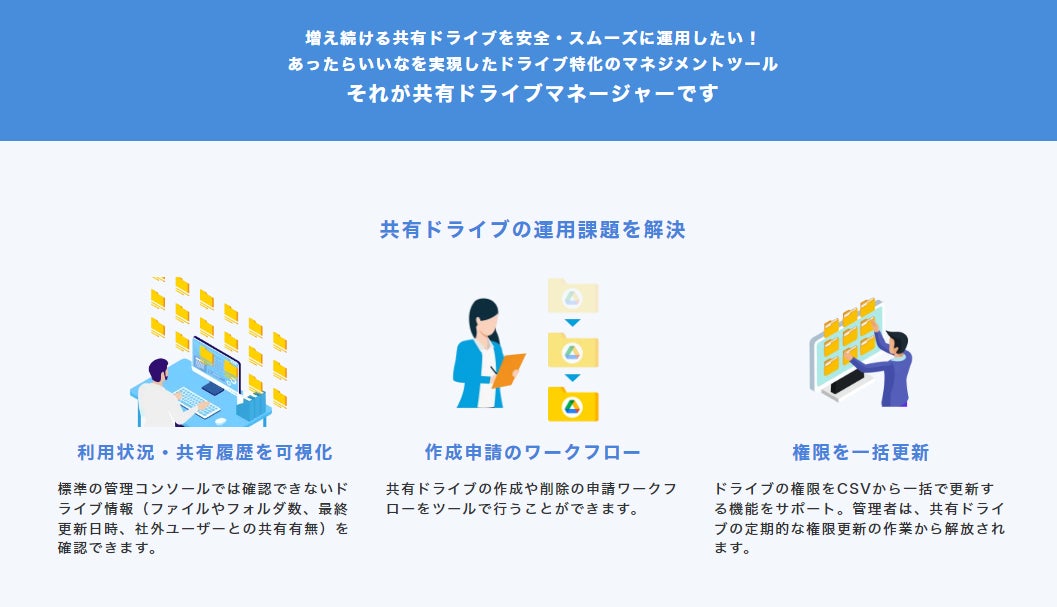 「共有ドライブマネージャー」は、Google ドライブ の共有ドライブに特化したサービスで「共有ドライブの標準機能を拡張した様々な機能」を提供します。管理者は「共有ドライブマネージャー」を利用することで、共有ドライブの運用を強化することができます。