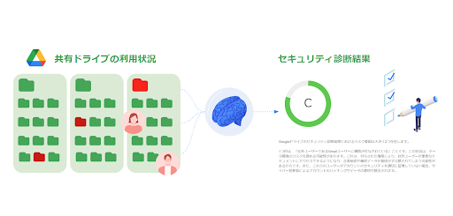 新機能「AIセキュリティ診断」は、共有ドライブの利用状況を取り込んだ情報を元に、AIがセキュリティを診断する機能です。