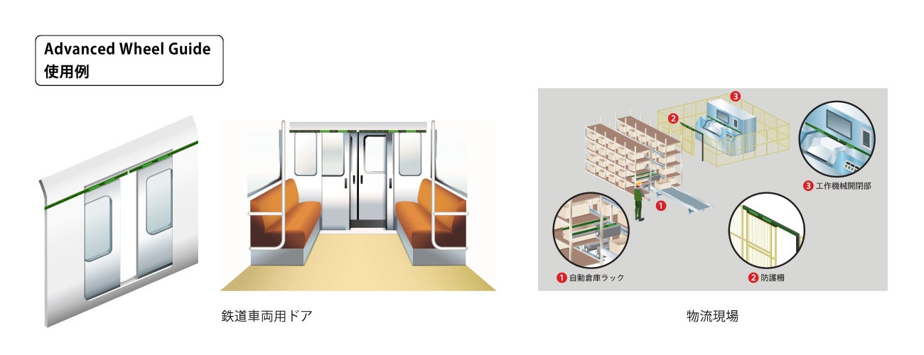 従来のスライドレールは、医療機器や各種事務機器などのスライド部に幅広く利用されてきましたが、「Advanced Wheel Guide」は鉄道業界や物流業界をターゲットとし、鉄道車両用ドアや物流現場における自動倉庫ラック、工作機械の扉開閉部などへの需要を見込んでいます。