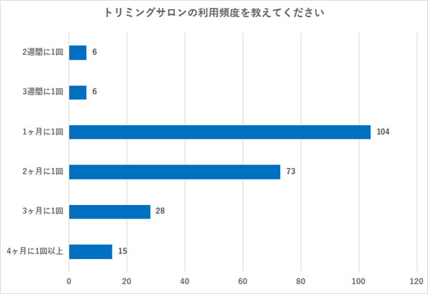 「トリミングサロンの利用頻度はどのくらいですか?」という質問に対して、「1ヵ月に1回」と回答した方が最も多い結果となりました。