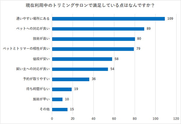 そこで、現状どのような点に満足しているか具体的に伺ったところ、回答結果からみなさんのトリミングサロンを選ぶ基準が見えてきました。