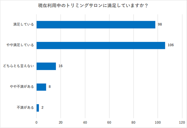 今回のアンケートでは、現在利用中のトリミングサロンに満足している・やや満足している方が大半でした。