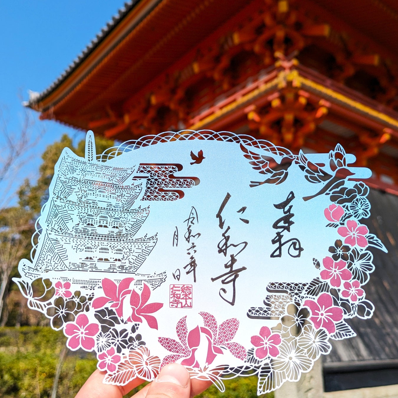仁和寺の代名詞である「御室桜」と、境内を彩るミツバツツジをピンクの箔押しで描きました。ブルーのグラデーションの台紙には、重要文化財である五重塔を繊細な切り絵で表現しています。切り絵御朱印を片手に、江戸時代から続く御室桜の美しさと仁和寺の爽やかな春をお楽しみください。