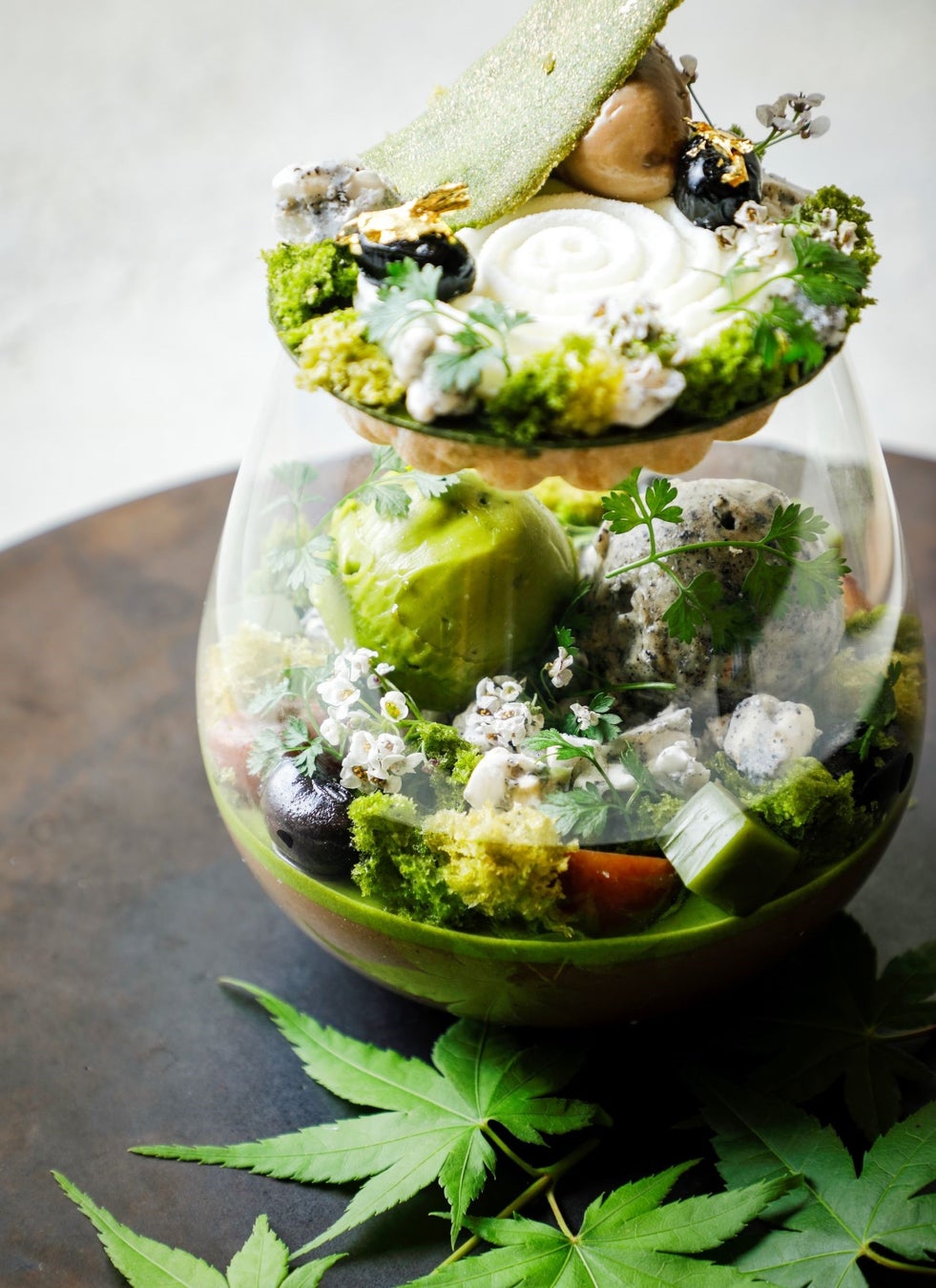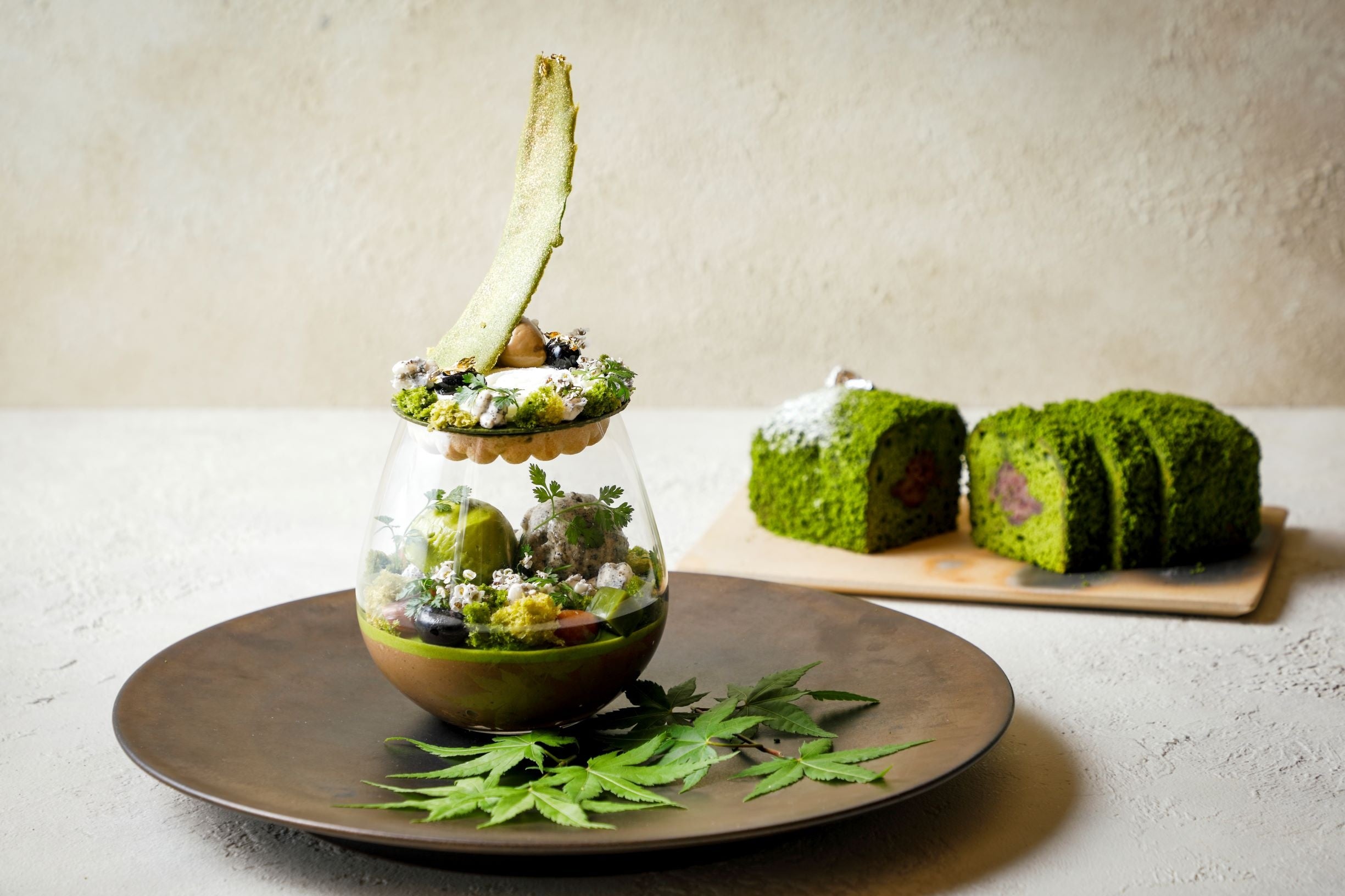 パフェ全体を美しく彩るのは、苔を模したオーガニック抹茶の2色からなるスポンジや、石と砂利をイメージし、黒ごまチョコレートでコーティングしたライスパフ。庭に自生するあせびの花をイメージした愛らしいエディブルフラワーや、優しい香りのハーブ、チャービルで表現した植物にもご注目ください。
