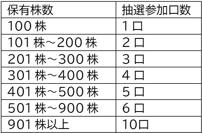抽選時の当選確率は抽選参加口数に応じて比例的に増加する仕組みです。ご応募頂いた株主様の保有株式数に応じて抽選参加口数を設定(上記2)し、総参加口数を分母としてランダムに当選者を抽出する方式を採用する予定です。