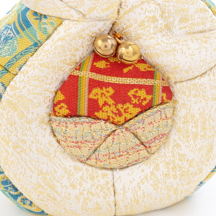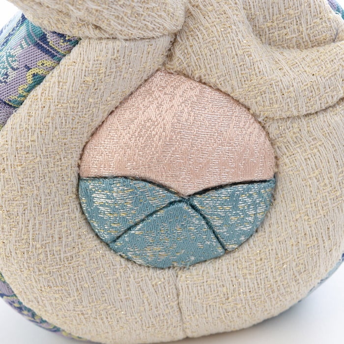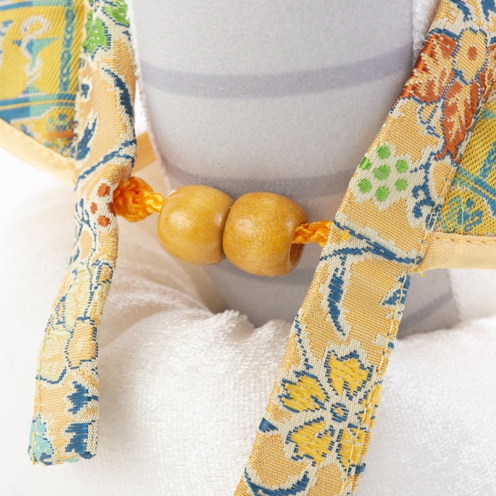 マスコット人形は、上品な中にも愛らしさが感じられる表情が印象的です。衣装となる部分には、衿(えり)部分に豪華な「早雲寺文台裂」と干支「巳」の新柄「薬棚の巳(くすりだなのへび)」を、背の部分には人気柄の「想い出」を使用しており、こちらも大変縁起の良いデザインとなっています。