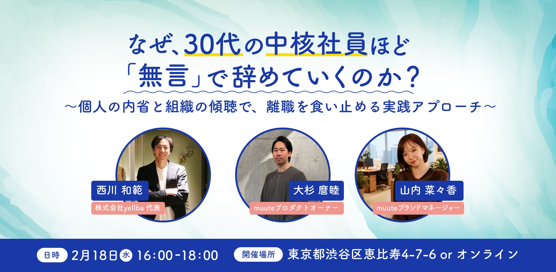 Nissay MIRAIQA株式会社(本社:東京都渋谷区、代表取締役社長:関 正之)が運営するAIジャーナリングアプリ「muute」と、社員のホンネを起点に採用力・定着力を高める組織改善クラウドサービスを展開する株式会社yellba(本社:東京都港区、代表取締役:西川 和範)は、2026年2月18日(水)16:00より、共催イベント『なぜ、30代の中核社員ほど「無言」で辞めていくのか? 〜個人の内省と組織の傾聴で、離職を食い止める実践アプローチ〜』を、弊社オフィス(恵比寿)およびオンラインにて開催いたします。