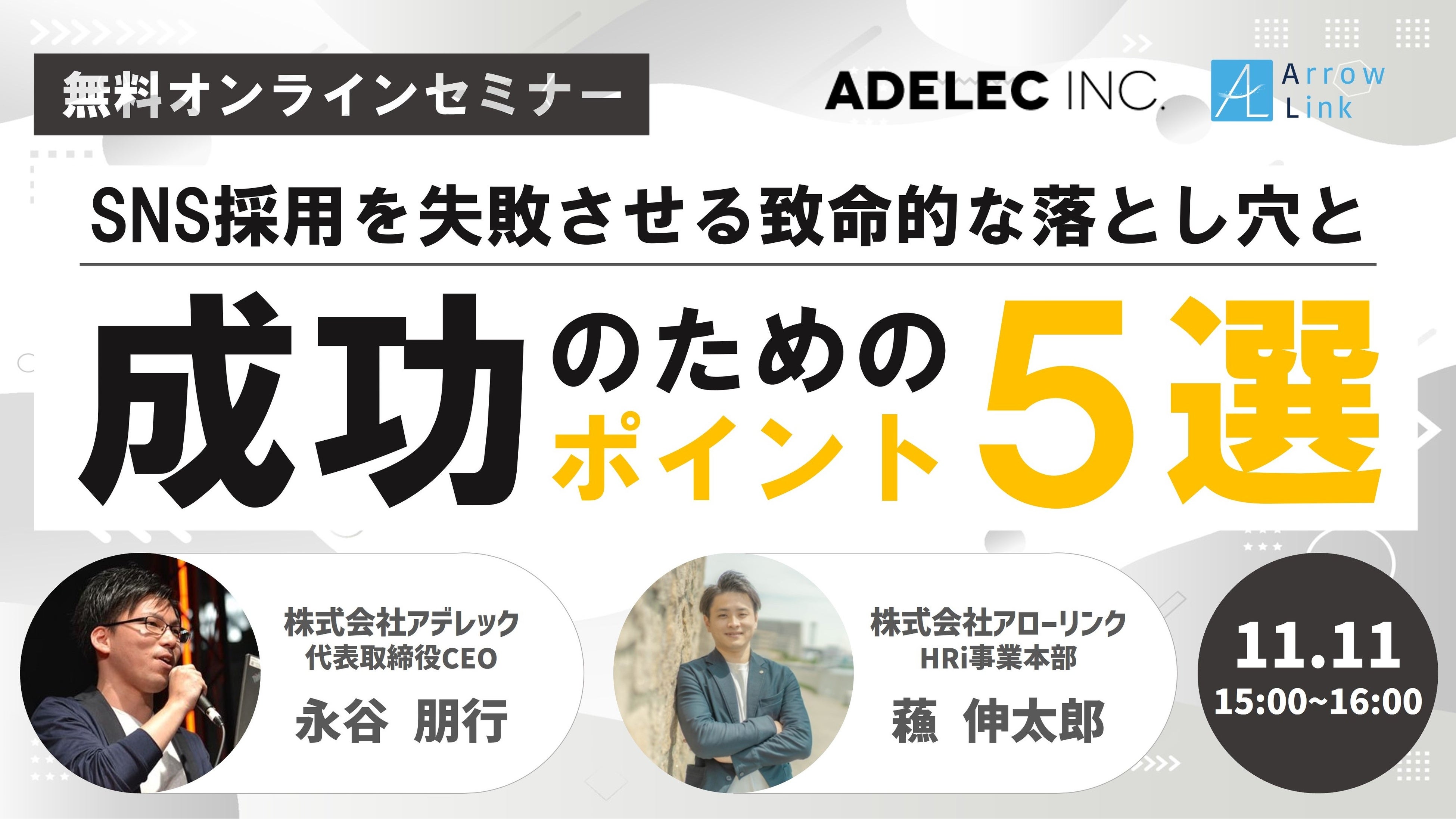 株式会社アローリンク(本社:兵庫県神戸市中央区、代表取締役:蓬莱和真)と、株式会社アデレック(本社:大阪府和泉市、代表者:永谷朋行)は、11/11(金)に無料オンラインセミナーを開催いたします。「SNS採用を失敗させる致命的な落とし穴と成功のためのポイント5選【解説セミナー】」と題し、Z世代に対する採用ノウハウなどをお伝えします。