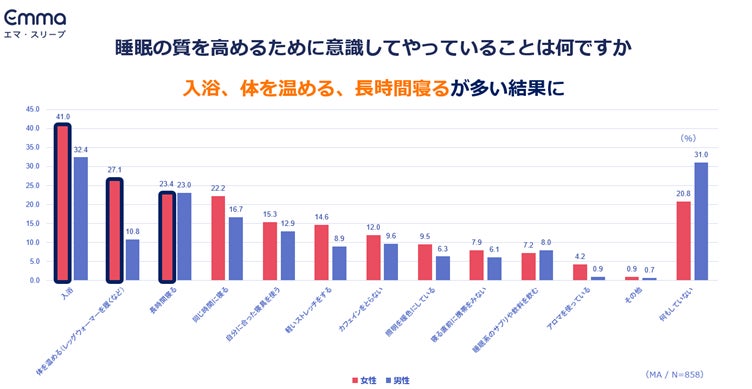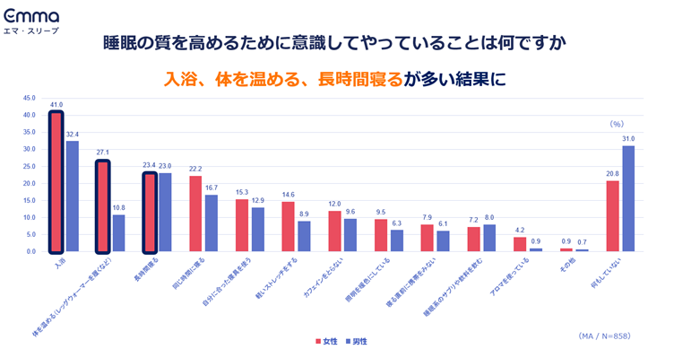 『睡眠の質を高めるために意識してやっていること』についての回答では、女性の41.0%が「入浴」と回答し、「体を温める(27.1%)」「長時間寝る(23.4%)」と続きました。また、「何もしていない」と回答した人が20.8%と、5人に4人は睡眠の質を高めるために、何かしら意識をしている実態が明らかになりました。