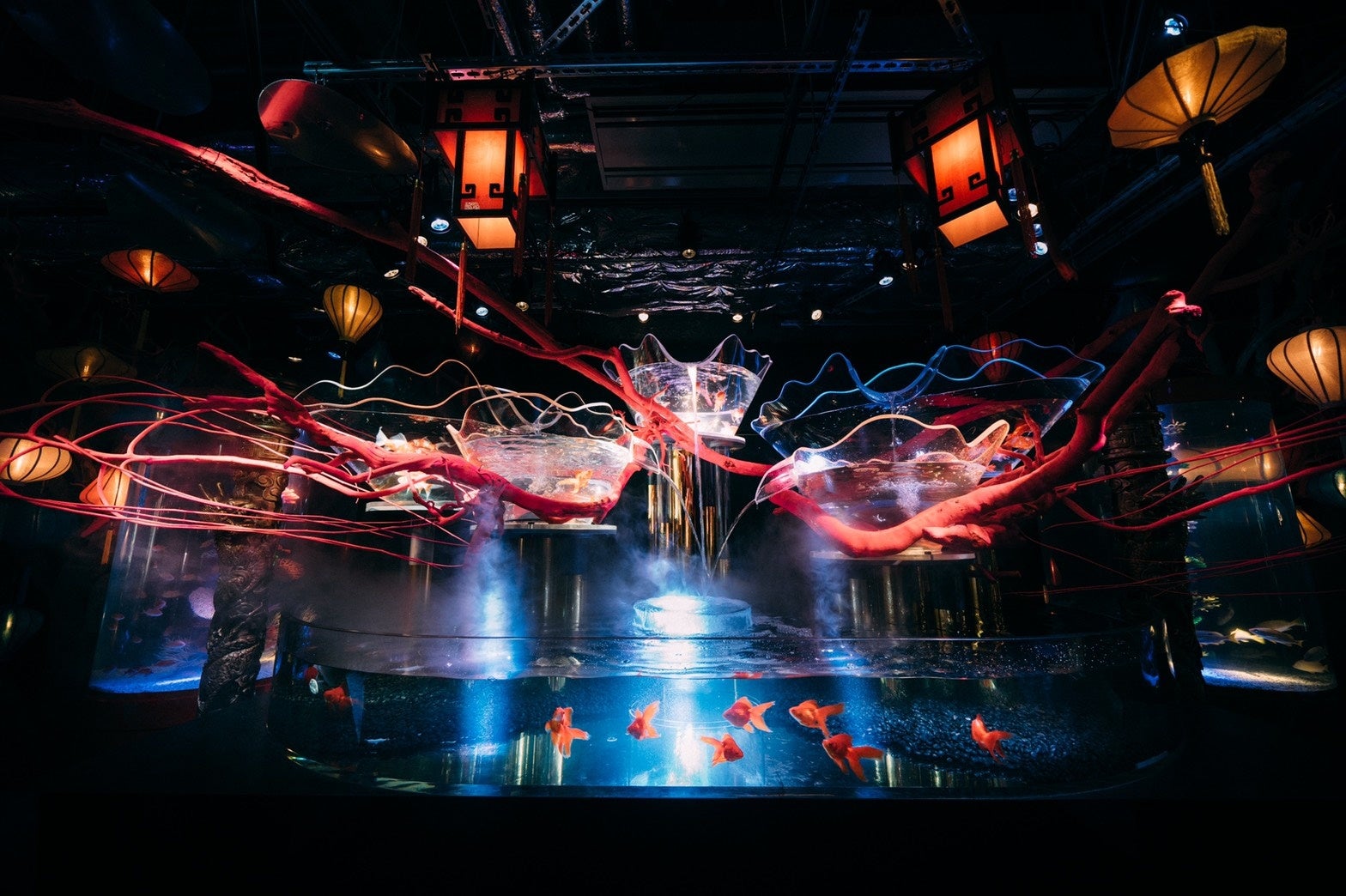 美しい魅惑的で華やかな羽衣をまとった花魁道中をひらりひらりと泳ぐ、生きた生命のアートである金魚を花魁に見立て、ネオジャパネスクに仕立てあげた空間作品。