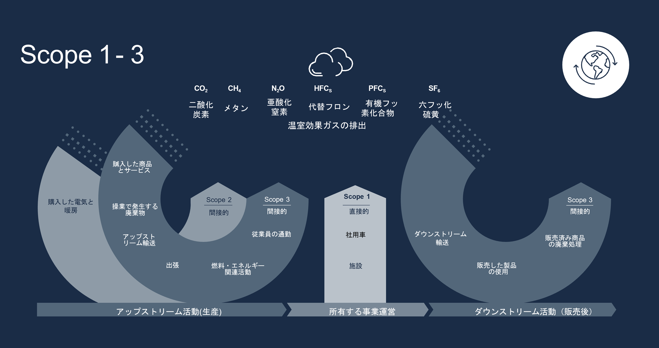 本社にある社用車や技術設備など、社が所有または管理する施設や設備からの排出量です。