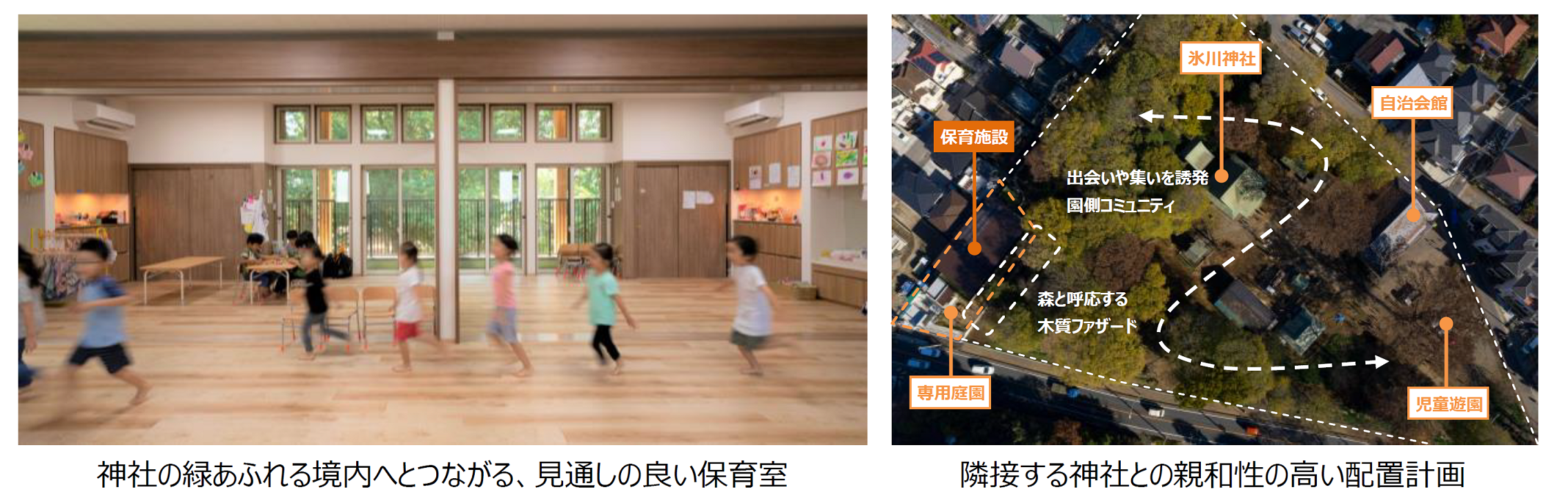 建物の外観は、柱を連続させて木質感を強調することにより歴史ある神社との一体感を醸成。また、風と光が心地よく抜ける見通しの良い保育室からは、神社の緑あふれる境内が見渡せて自然と向き合える配置になっています。あわせて、園庭デッキや芝テラスなども設けることで、神社と関わりのあるコミュニティとの豊かな出会いを創出。日々の子どもの活動を表出することにより、地域の見守りを充実させています。