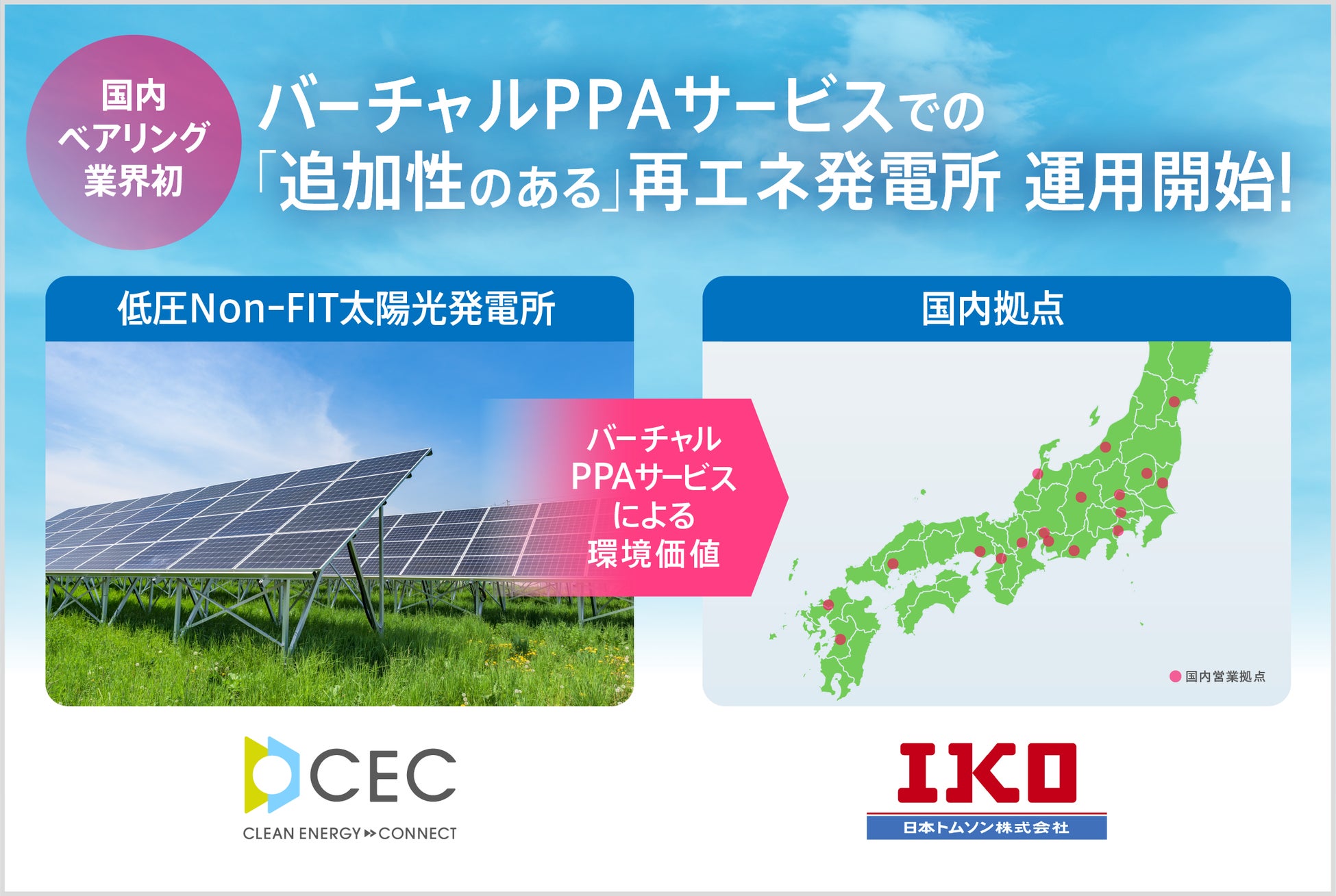 ベアリングおよび関連機器の製造・販売を行う日本トムソン株式会社(代表取締役社長:宮地茂樹、以下「日本トムソン」)と、脱炭素経営企業、RE100参加企業等のお客様に対して脱炭素ソリューションをご提供する株式会社クリーンエナジーコネクト(代表取締役:内田鉄平、以下「クリーンエナジーコネクト」)は、2023年5月にバーチャルPPAサービス契約を締結していましたが、今回、日本トムソン専用のNon-FIT低圧太陽光発電所を新たに9か所開発し※2、バーチャルPPAサービスの運用を開始したことをお知らせします。バーチャルPPAサービスのスキームを活用した追加性のある再生可能エネルギーの導入としては、国内ベアリング業界で初めての運用開始となります。