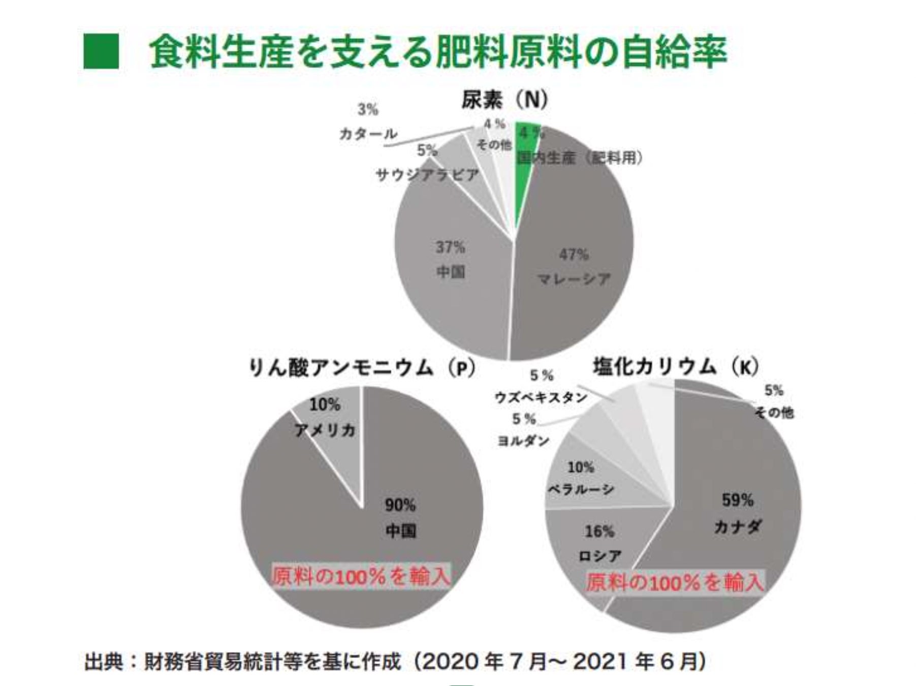 窒素はほぼ全量97.5%が輸入依存でありその生産工程は環境負担も大きい