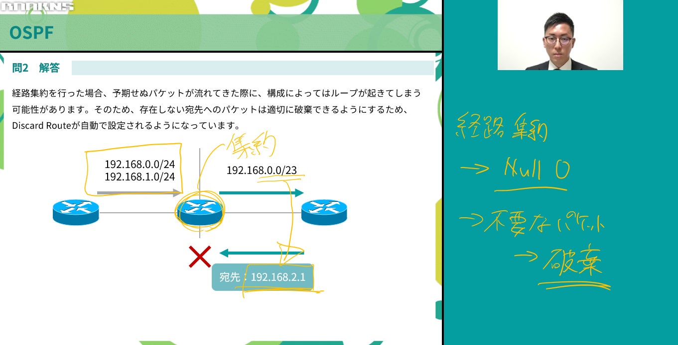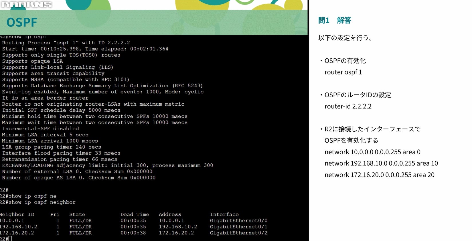 各問題の解説には実際のネットワーク機器を用いた設定を行う様子も含めております。そのため、実際に設定を試す環境が用意できなくても、設定した際のイメージを掴みやすい講座となっております。