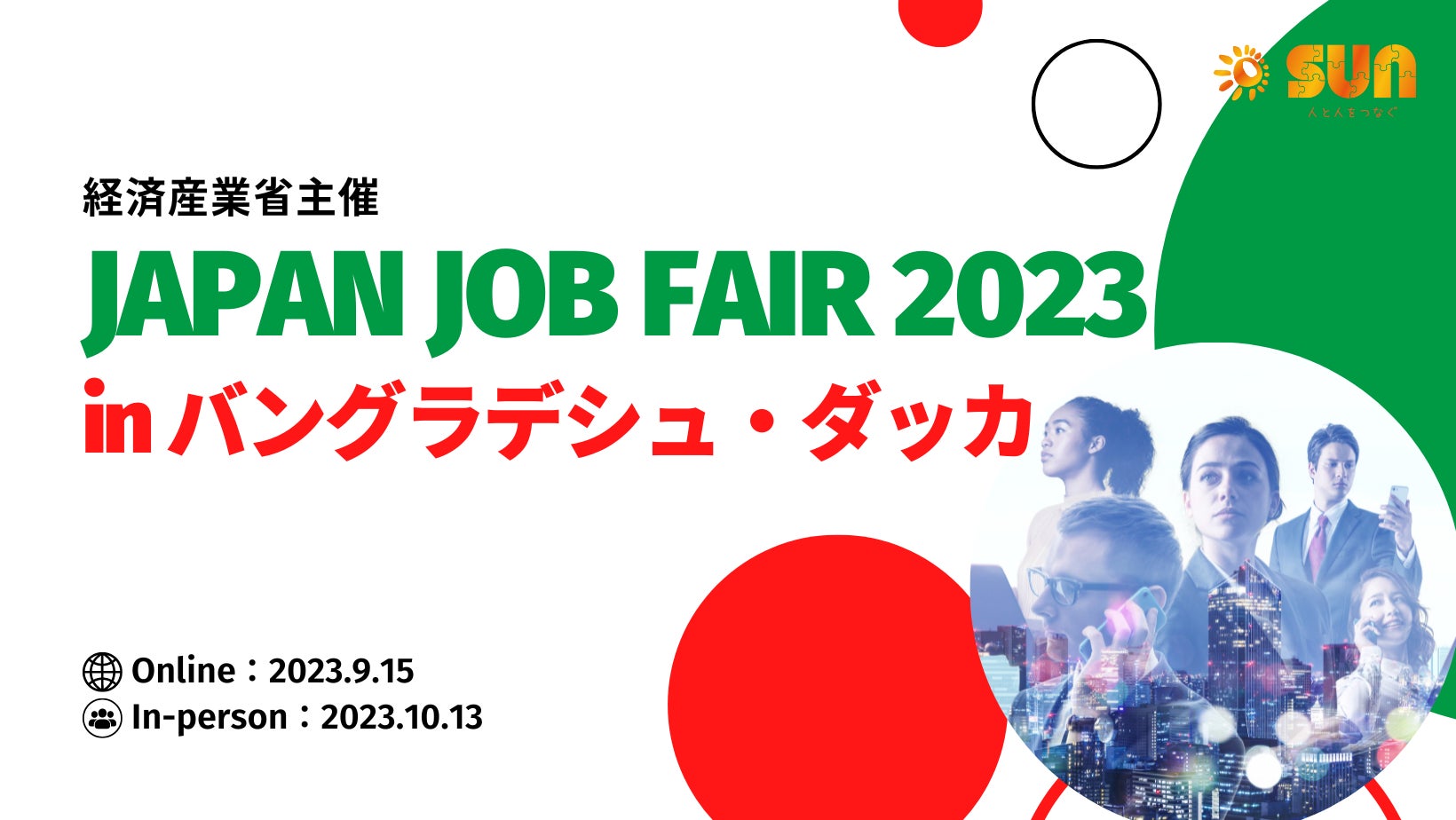 SUN株式会社(本社:東京都港区、代表取締役社長兼CEO:仲宗根俊平、以下 SUN)は、2023年9月15日と同年10月13日にバングラデシュの首都、ダッカで開催される経済産業省主催のジョブフェア「JAPAN JOB FAIR 2023 in Dhaka」に出展することをお知らせいたします。
