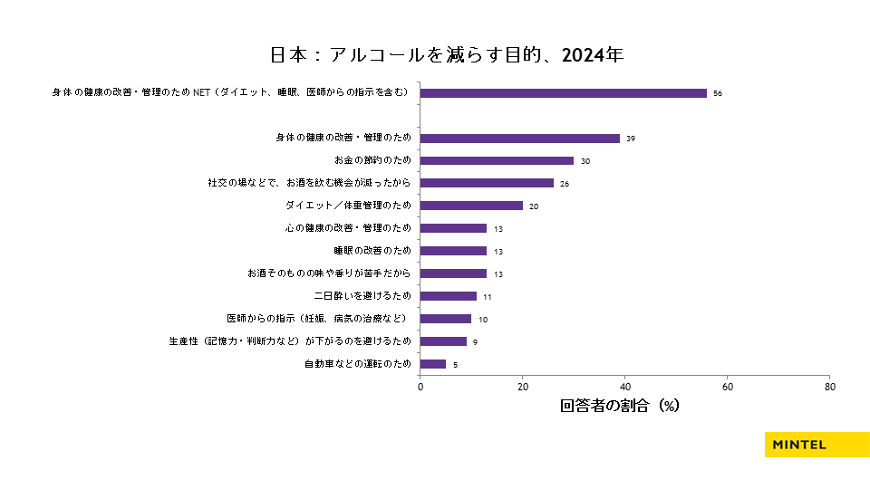 ミンテルが行った調査によると「日本では5人に1人がお酒を減らしている」と回答しており、アルコール市場に異変が起きています。 飲めないからではなく、おいしいからノンアルコールを選ぶ女性や、アルコールによる生産性の低下を意識してアルコールを減らしている男性など、ソバーキュリアス(あえてお酒を飲まないライフスタイル)と呼ばれる人が増加しています。また、アルコールを減らす目的として56%の人が「身体の健康の改善」と回答しており、健康意識の向上が伺えます。