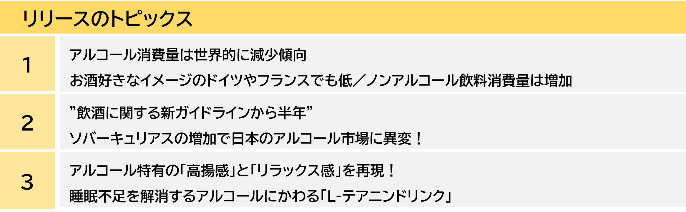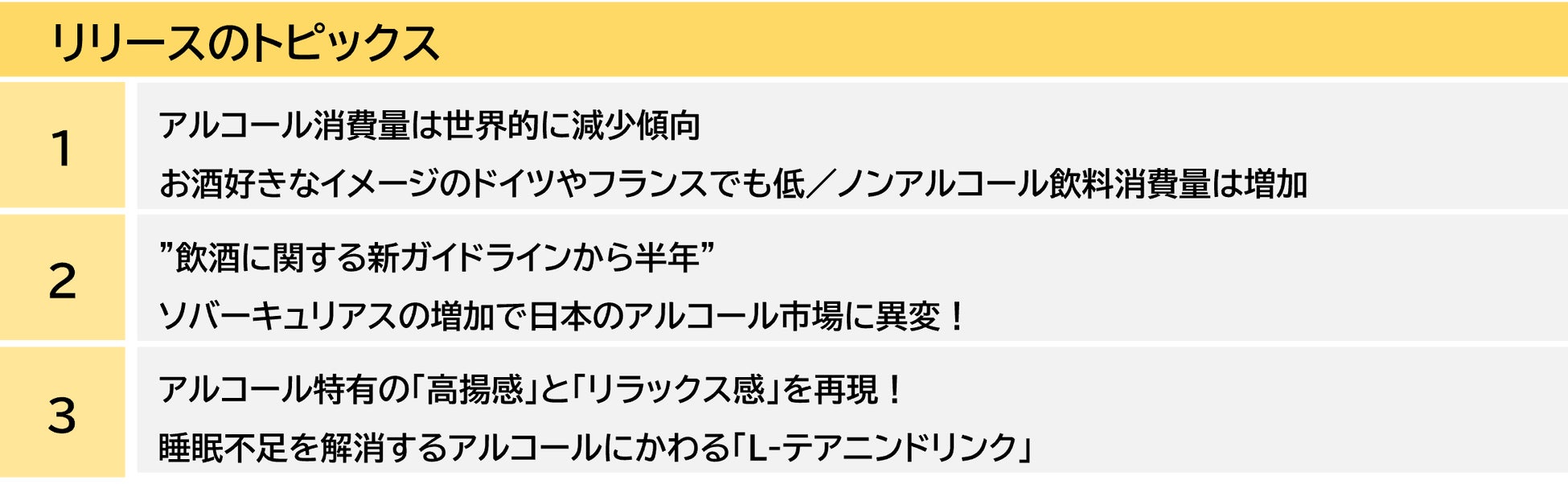 そんな背景から、低/ノンアルコール飲料が脚光を浴びており、同カテゴリー商品も増加傾向にあります。本レポートは、同カテゴリー商品群において、日本でトレンドになりそうなトピックを調査・分析しています。ノンアルコール飲料では、単に味や香りを模倣するだけでなく、アルコールの効果までを再現する製品が登場し、商品開発も新たな段階に入っています。また、より健康志向が高まる生活者の中では、「L-テアニンドリンク」が、アルコールオルタナティブ(アルコール飲料の代替品)として注目されています。猛暑が続く夏の時期、アルコールに代わり「L-テアニンドリンク」を飲むことで熱帯夜を快適に過ごすことができるかもしれません。本レポートでは、消費者がどのような低/ノンアルコール飲料を求めているのか、市場トレンドにも触れながら明らかにしています。
