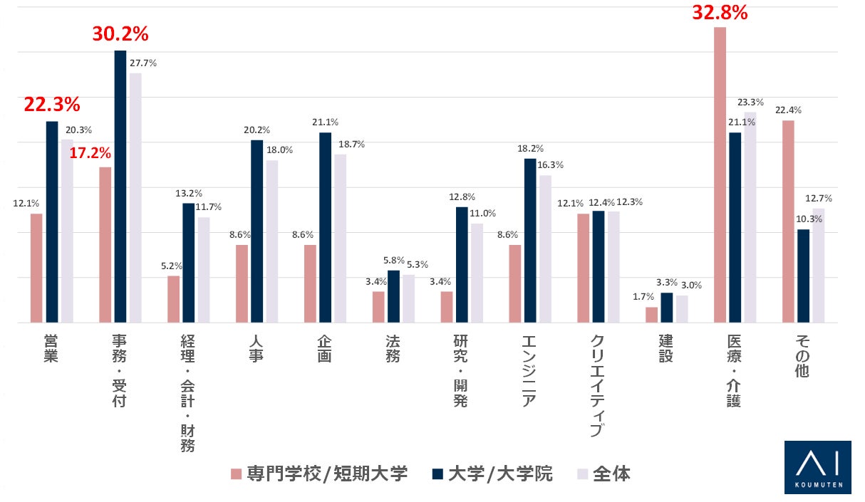 希望する職種について聞いたところ、全体では1位は「事務・受付」で27.7%、2位は「医療・介護」で23.3%、3位は「営業」で20.3%という結果になりました。また、通っている学校区分別に見てみると、大学/大学院に通っている方では「事務・受付」が最も多く30.2%、次いで「営業」22.3%という結果となりました。一方、専門学校/短期大学に通っている方では「医療・介護」が最も多く32.8%、次いで「事務・受付」が17.2%となっております。