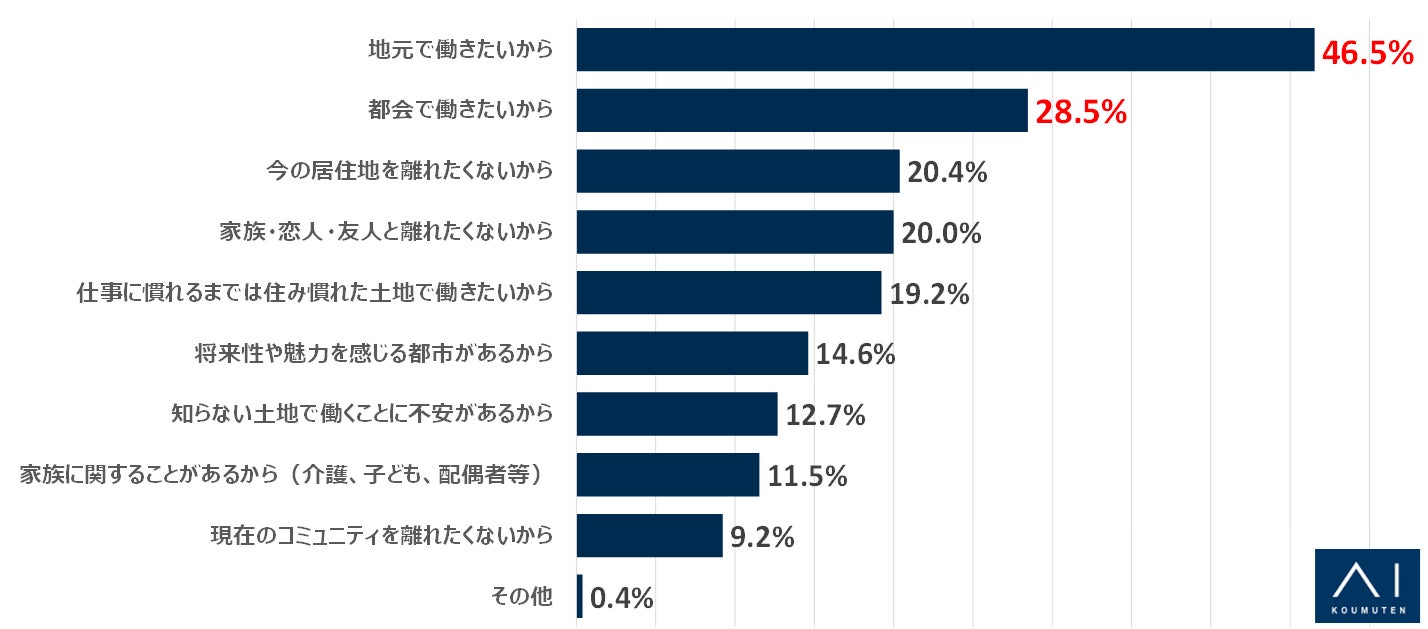 また、理由についても聞いたところ「地元で働きたいから」が最も多く46.5%、次いで「都会で働きたいから」が28.5%と、働く土地を重要視していることが判明しました。また、「家族・恋人・友人と離れたくないから」と答えた学生も20.0%おり、就職を機に大切な人と離れ離れになることに抵抗がある学生も多いようです。