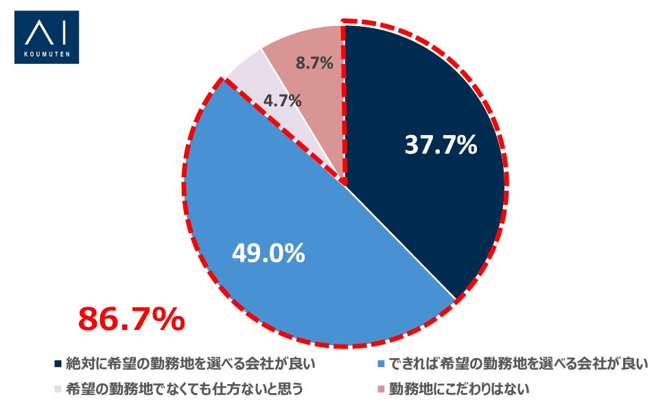 勤務地に対する考え方を聞いたところ、「絶対に希望の勤務地を選べる会社が良い」が37.7%、「できれば希望の勤務地を選べる会社が良い」が49.0%の合計86.7%の学生が「希望の勤務地を選べる会社が良い」と考えていることが判明しました。