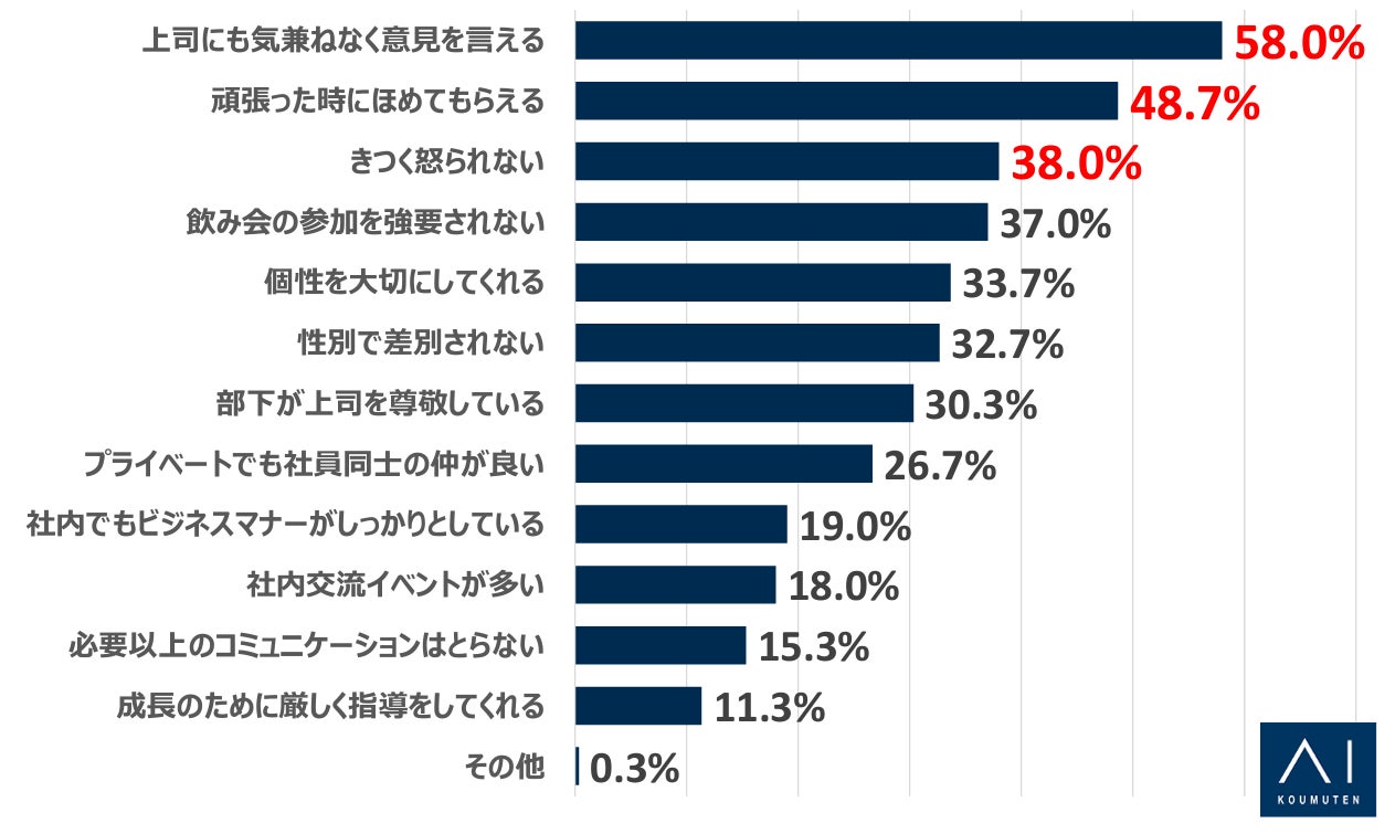 理想の職場の雰囲気を聞いたところ、「上司にも気兼ねなく意見を言える」が58.0%で最も高く、 次いで「頑張った時にほめてもらえる」が48.7%、「きつく怒られない」が38.0%と、Z世代ならではの働きやすい職場の雰囲気に対する考え方が明らかになりました。