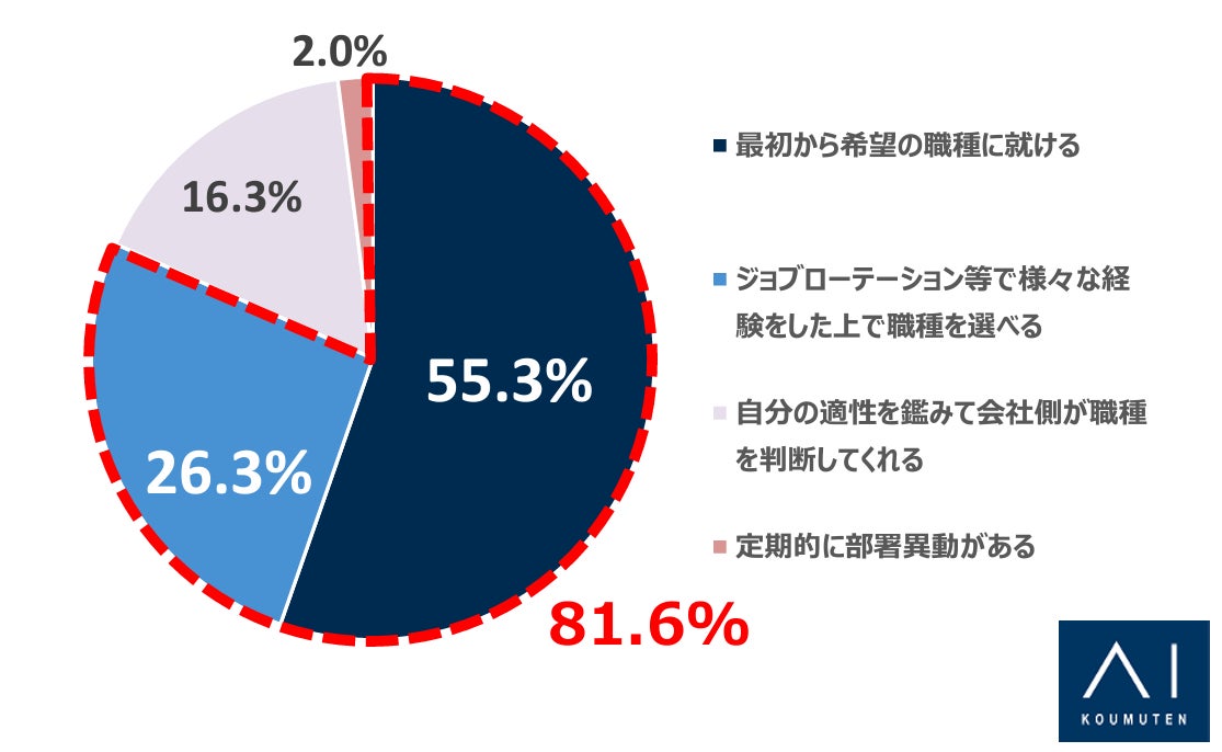 理想の職種の決定方法を聞いたところ、「最初から希望の職種に就ける」と回答した学生が55.3%と最も多い結果となりました。また、「ジョブローテーション等で様々な経験をした上で職種を選べる」と回答した学生も26.3%おり、合計81.5%の学生が職種を自身で決定したいと思っていることが判明しました。