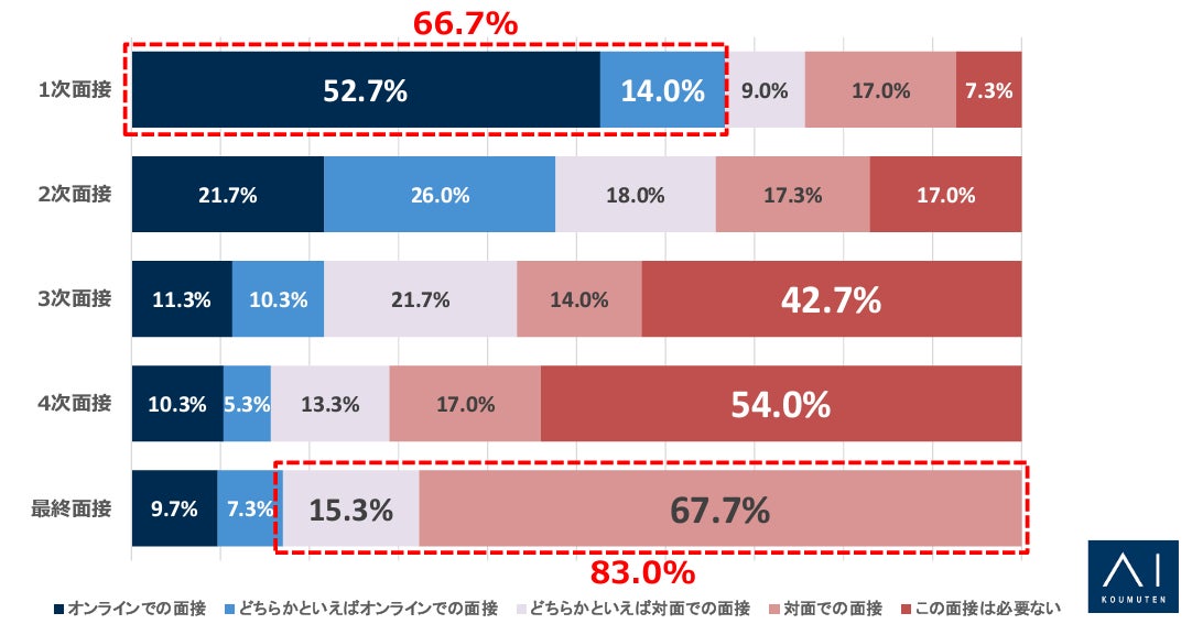 最後に、理想の面接形態・面接回数を聞いたところ、1次面接はオンラインで行いたいと回答した学生が約7割と、企業とのファーストコンタクトは非対面式を希望する学生が多いという結果になりました。一方で、最終面接は対面で行いたいと回答した学生が約8割と、最終的には対面式で実際に会うことを希望する学生が多いようです。