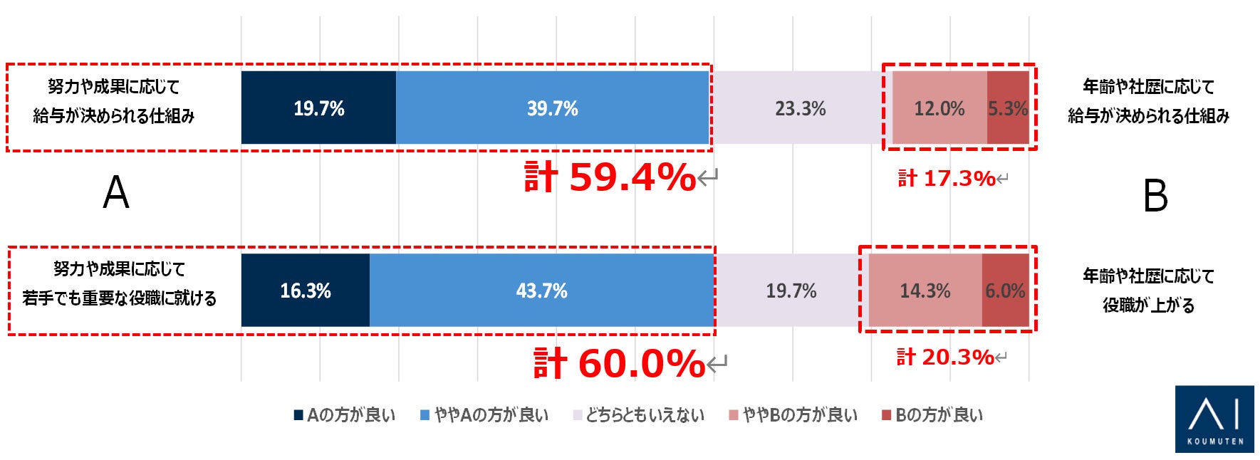 また、出世・昇進に対する考え方としては、「年齢や社歴に応じて役職が上がる」方が良いと答えた学生が20.3%に対し、「努力や成果に応じて若手でも重要な役職に就ける」方が良いと答えた学生が60.0%と、こちらも約3倍近く多いという結果になりました。